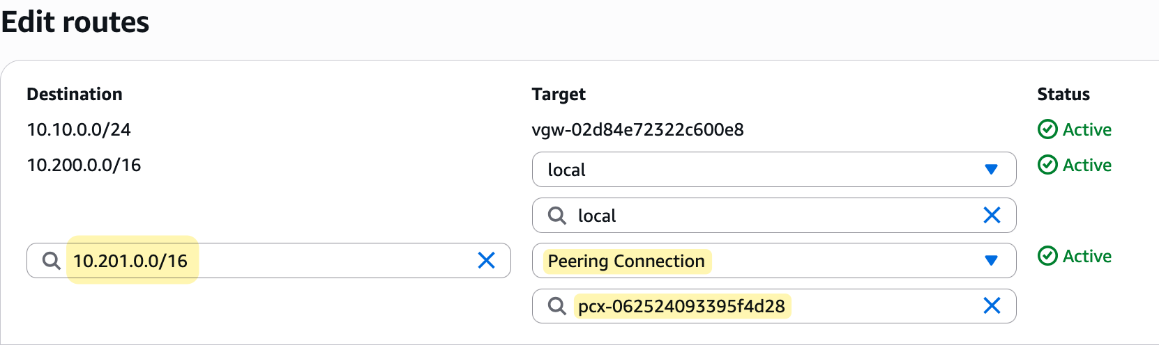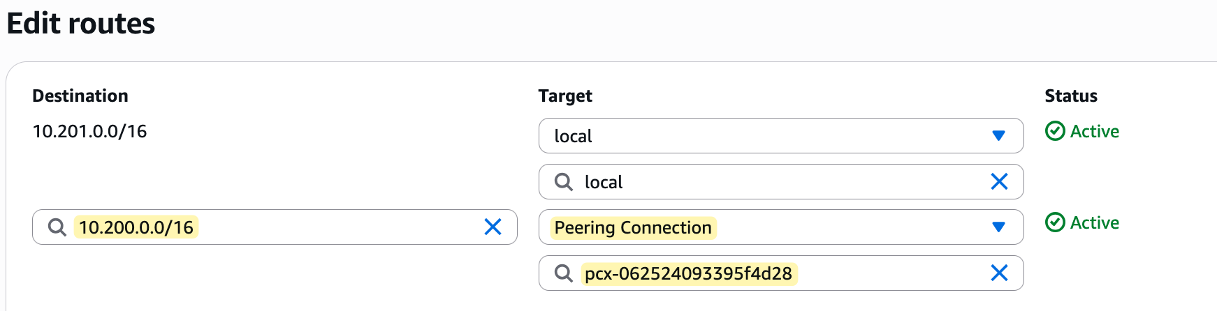 Once the peering connection is accepted and active, the rest of the setup is the same as before. You must update the route tables in both VPCs to direct traffic destined for the other VPC's CIDR range to the peering connection.