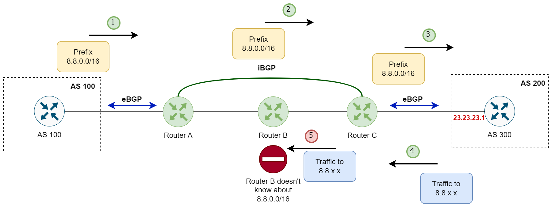 - Router C forwards the traffic to Router B, expecting that Router B will then send it to Router A. But here's the problem, Router B does not have any information about the 8.8.0.0/16 prefix because it has no iBGP session with Router A or Router C; hence, it never learned the route.