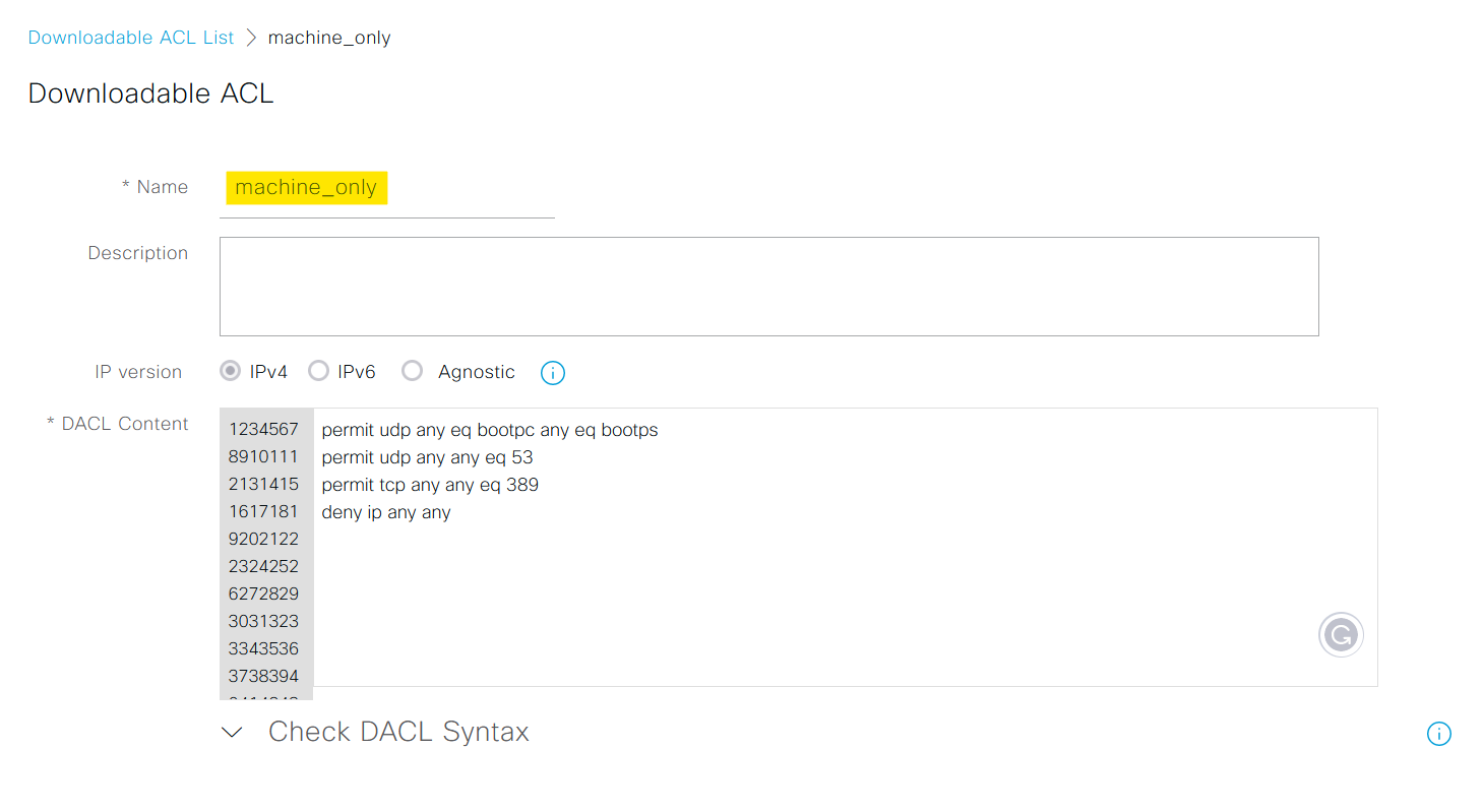 Firstly, let's create a Downloadable ACL (dACL). This dACL permits only the most basic of access such as DHCP, DNS and LDAP. This is the "bare minimum" access we allow for machine-only authentication.