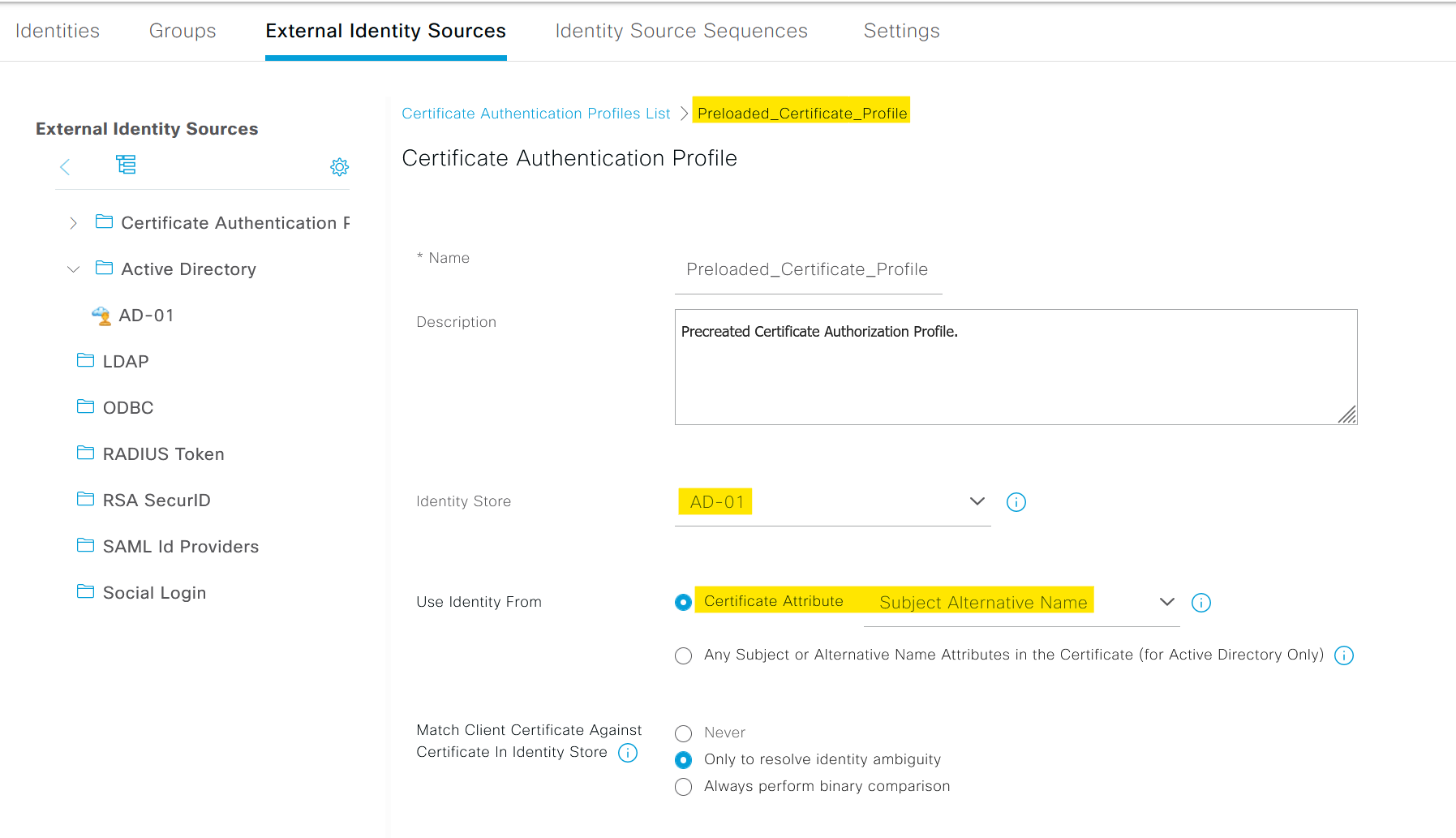 From ISE GUI, navigate to Administration > Identity Management > External Identity Sources > Certificate Authentication Profile and select or add a profile. I'm using the default profile for this example and pointing the Identity Store to Active Directory.