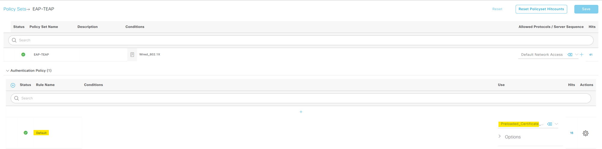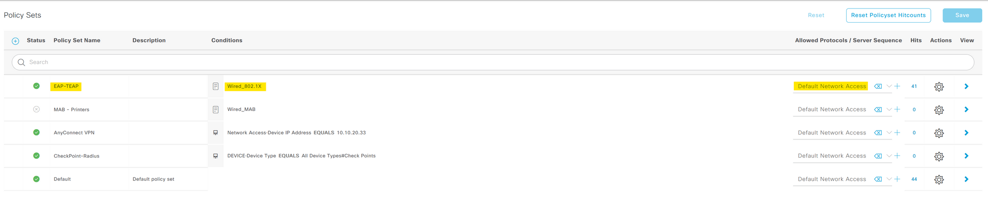 Here you must have noticed that the 'Allowed Protocols' is set to 'Default Network Access'. This is the default list that comes with ISE. Here you can specify which EAP protocols the clients can use. In our case, we are using EAP-TEAP which is already allowed (by the check box). Please ensure that you check 'Enable EAP Chaining' too.
