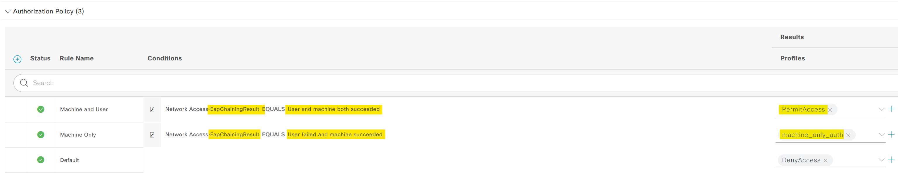 For the Authorization Policy, we are providing access levels based on whether we are dealing with machine-only or both machine and user authentications. The goal is to provide minimum access for machine-only situations, while full access is provided when both the machine and the user are authenticated.