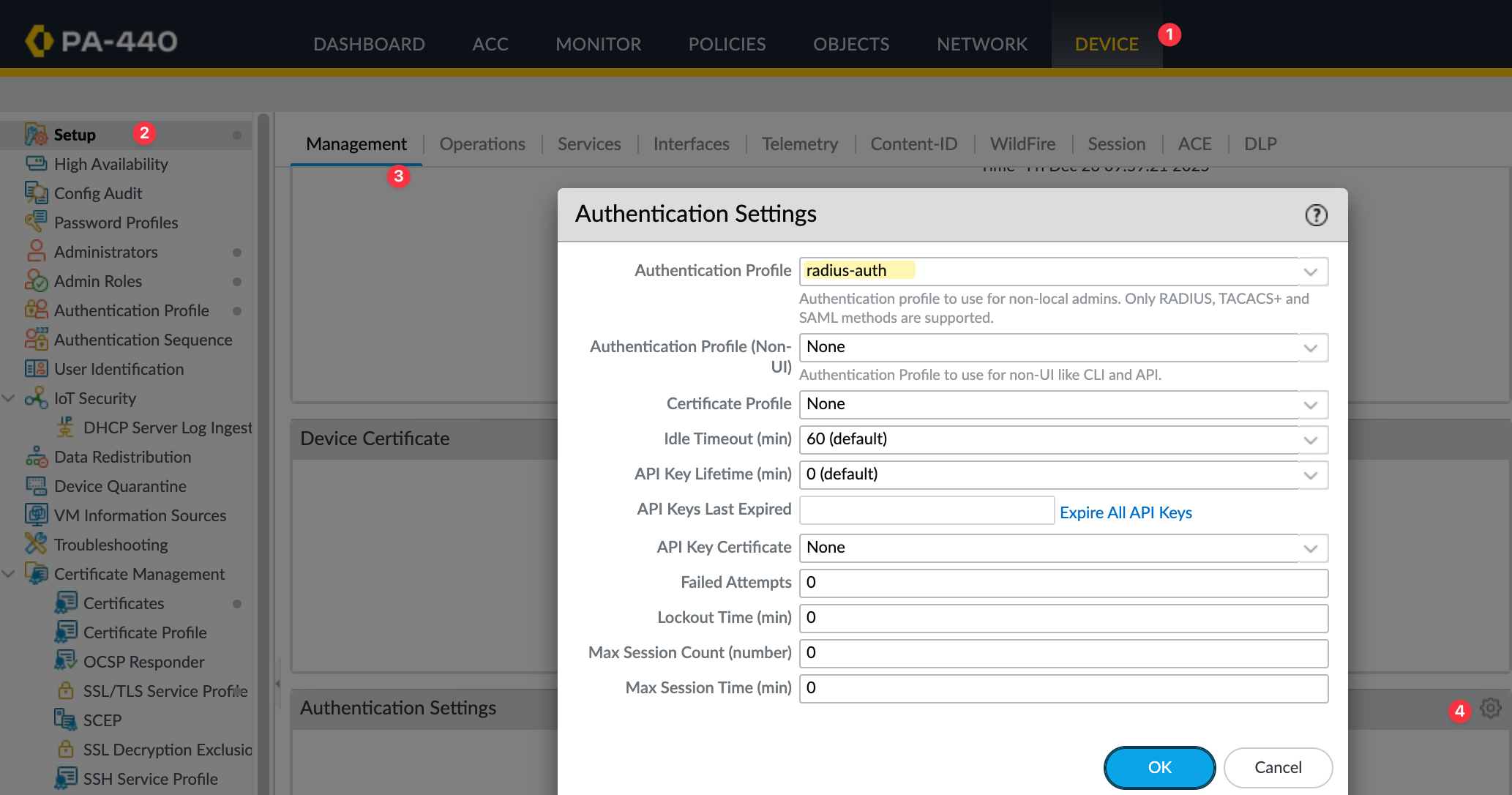 Finally, apply the authentication profile to the firewall management settings. Navigate to Device, then Setup, and open the Management tab. Click on Authentication Settings and select the radius-auth profile we created earlier as the authentication profile for administrators.