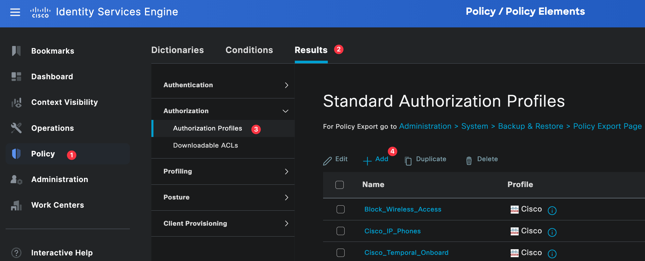 You can navigate to authorization profiles by going to Policy, Policy Elements, then Results, and selecting Authorization Profiles.