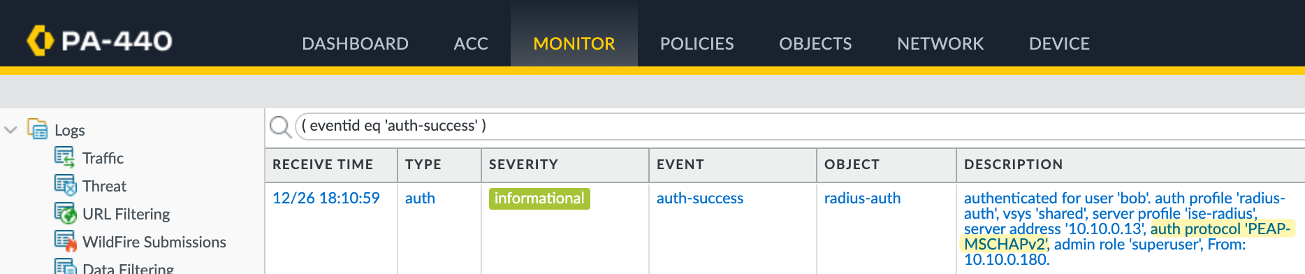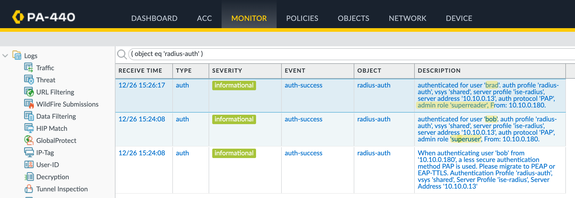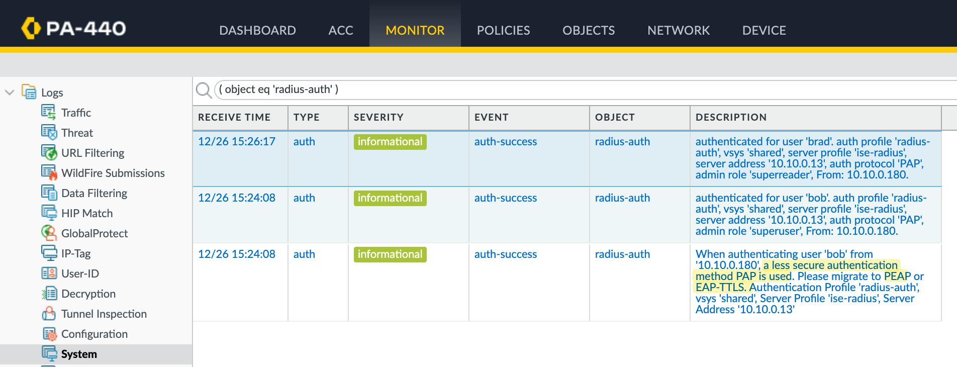 If you look at the Palo Alto logs, you will see a warning stating that PAP is a less secure authentication method and recommending PEAP or EAP-TTLS instead.