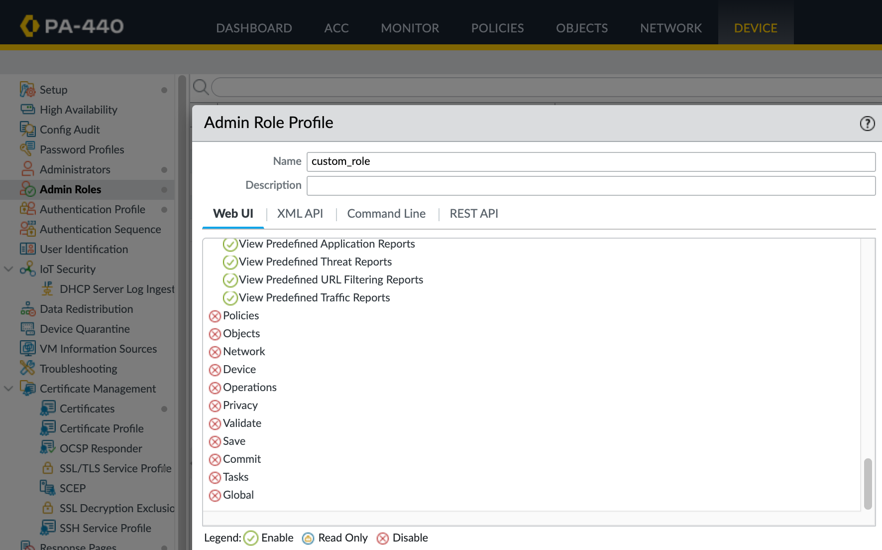 To create a custom role, navigate to Device, then Admin Roles, and create a new role. From here, you can allow, deny, or set read-only access for each section of the GUI, CLI, and APIs.