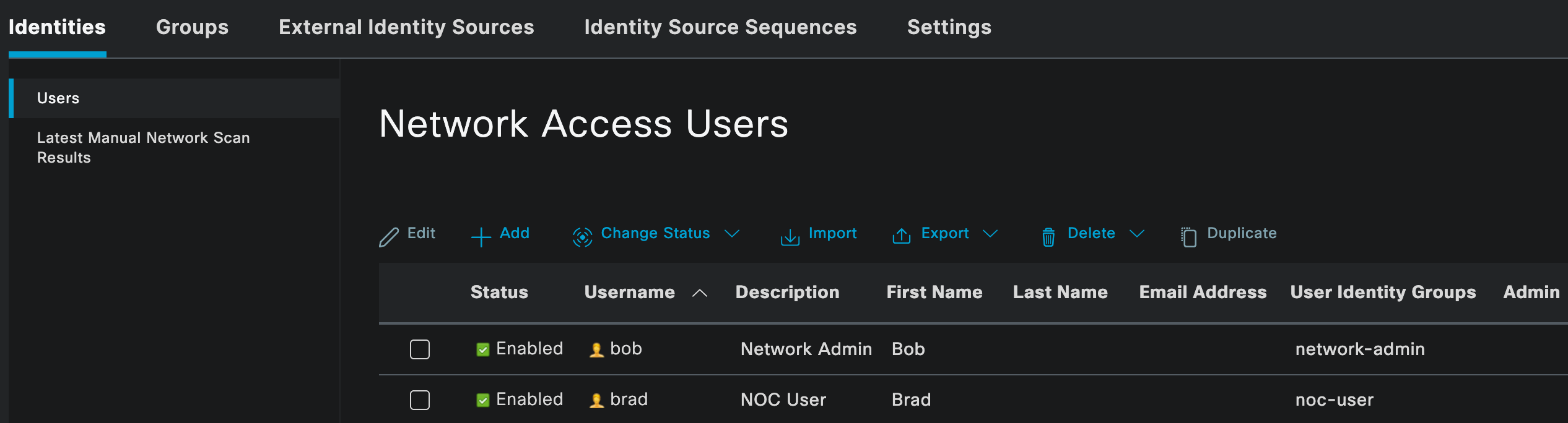 As mentioned earlier, I am using local users and identity groups in Cisco ISE for this example. In most production environments, this would usually be an external identity source such as Active Directory.