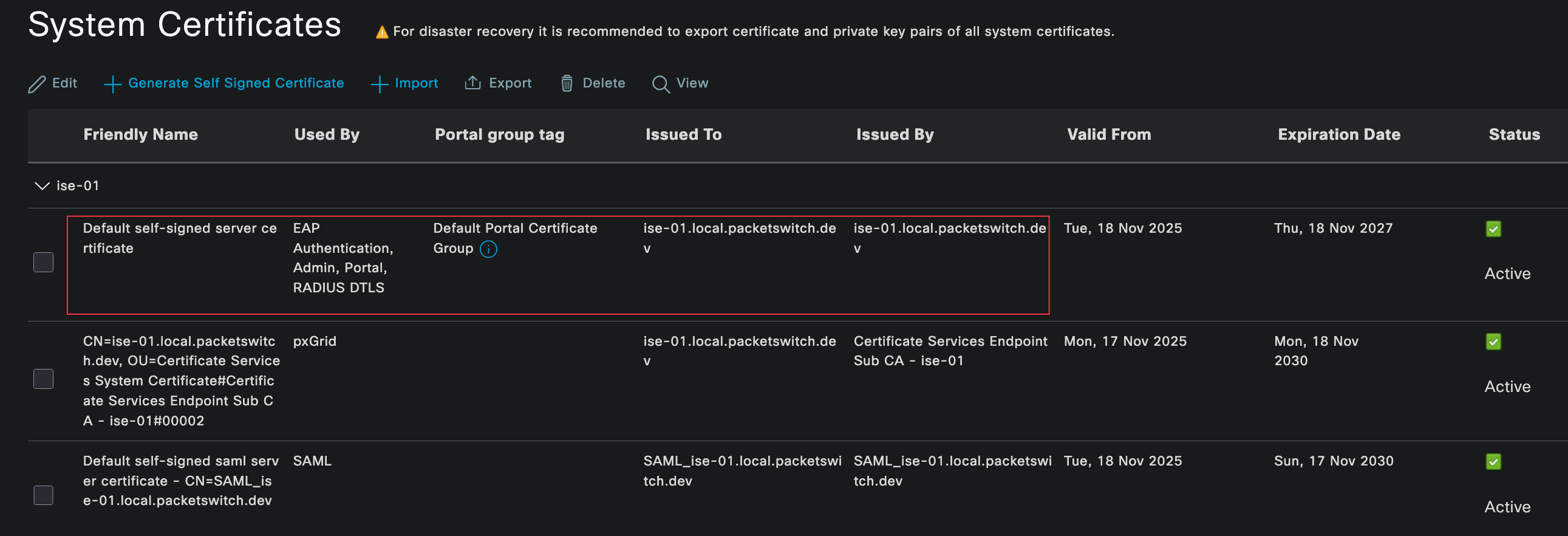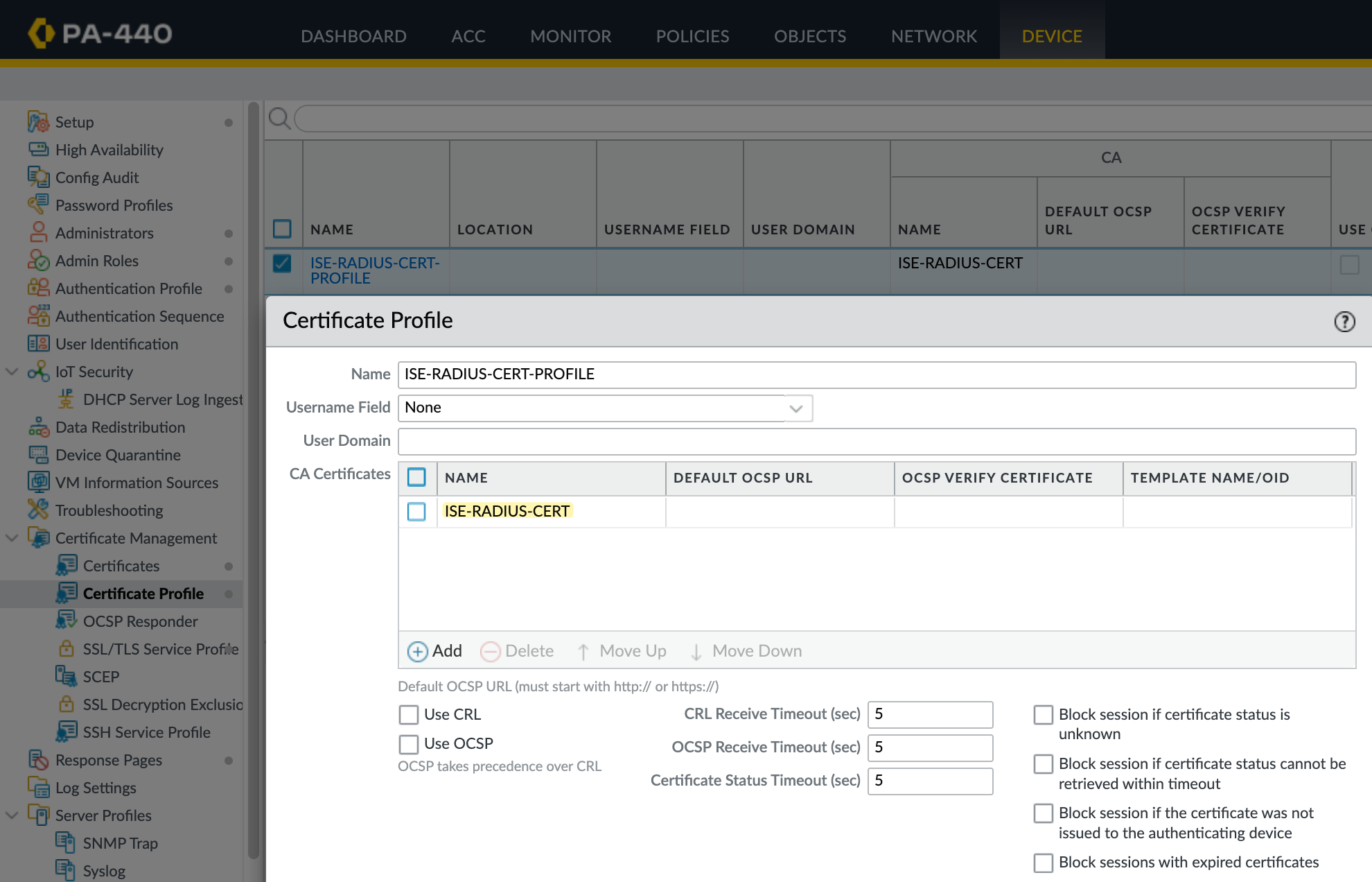 Since this is a lab setup, I am keeping things simple. I exported the self-signed server certificate from ISE and imported it into the firewall. I then created a certificate profile that trusts this certificate.