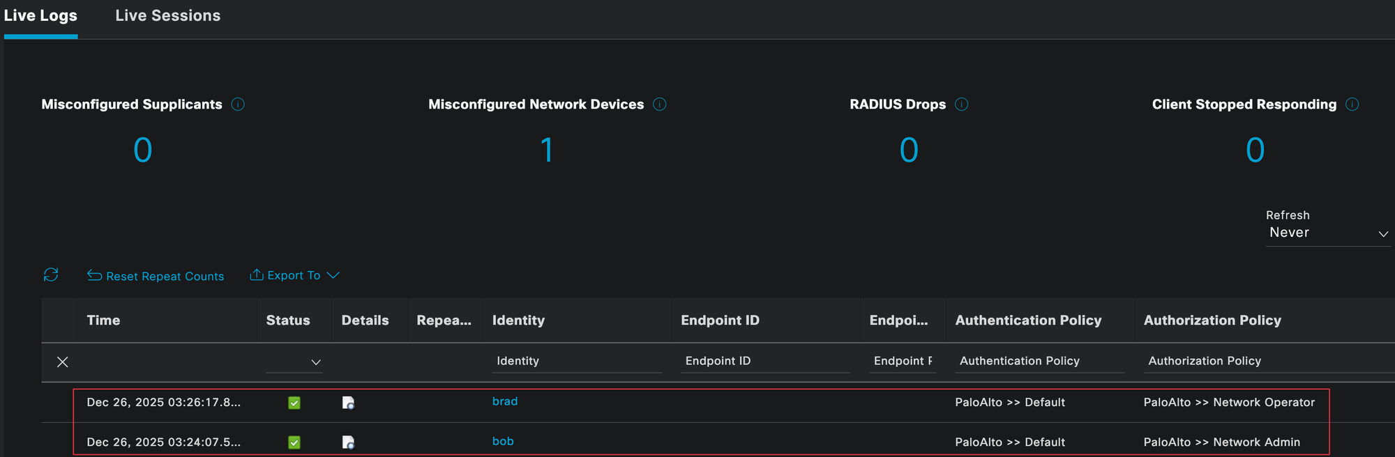 I logged in as both bob and brad, and you can clearly see that each user matched the correct authentication and authorization policies, along with the expected authorization profile.