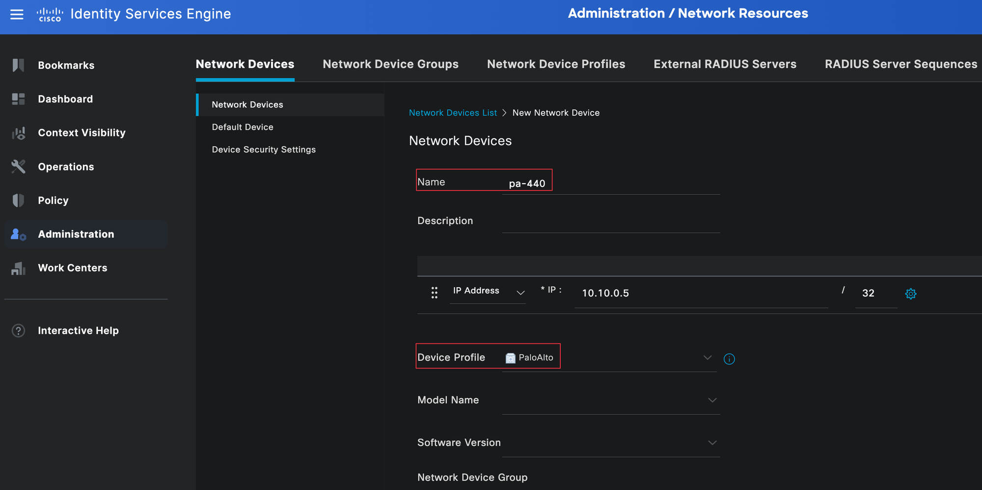 Navigate to Administration, Network Resources, then Network Devices and create a new device. Specify the hostname and IP address of the firewall, then associate it with the device profile we created earlier. You can leave most of the other fields set to their default values.