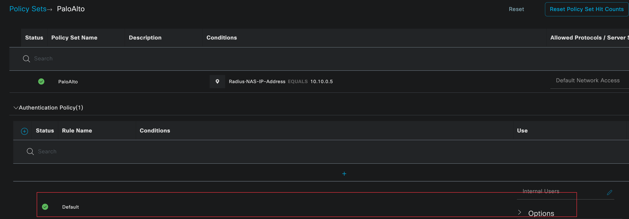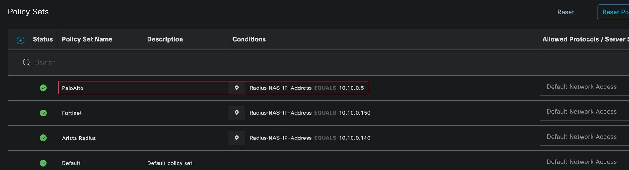 A policy set can be matched against many conditions, such as device vendor, device location, or protocol type. To keep things simple, we are matching the policy set based on the IP address of the firewall using the Radius NAS IP address (this doesn't scale well on real environments, as you may have guessed 😄)