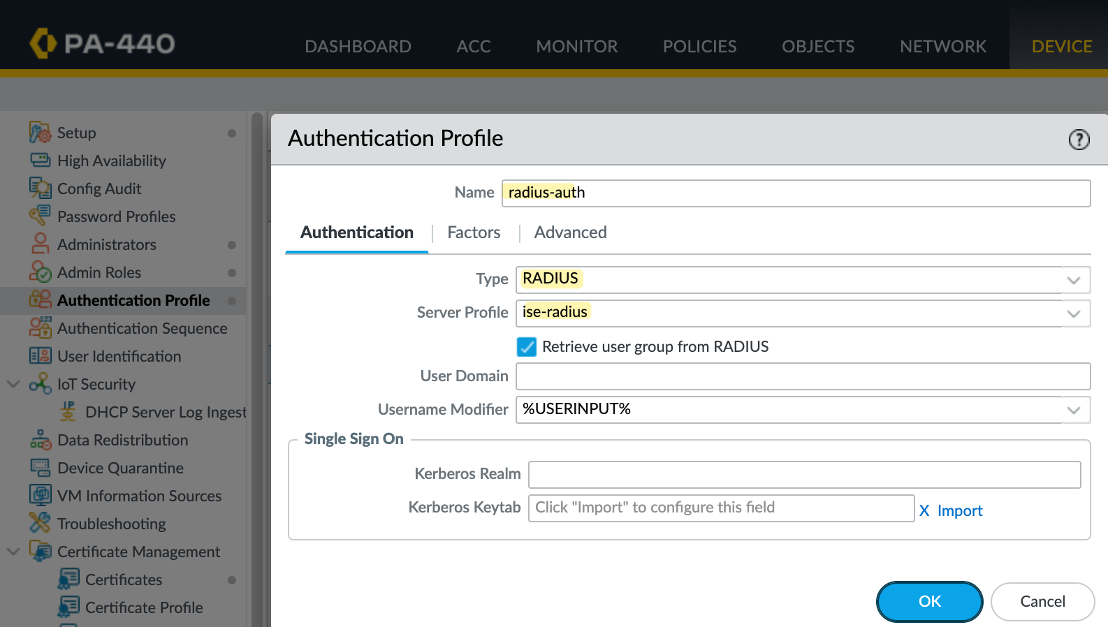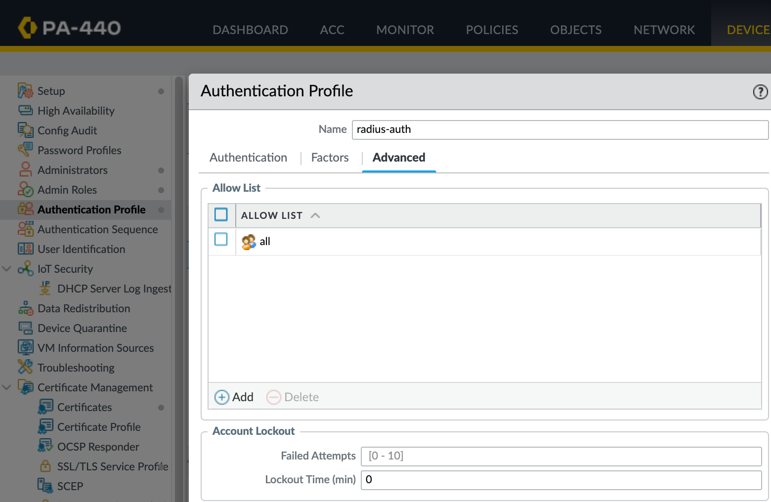 Next, create an authentication profile by navigating to Device, then Authentication Profile, and create a new profile. Set the type to Radius and select the Radius server profile you created earlier.
