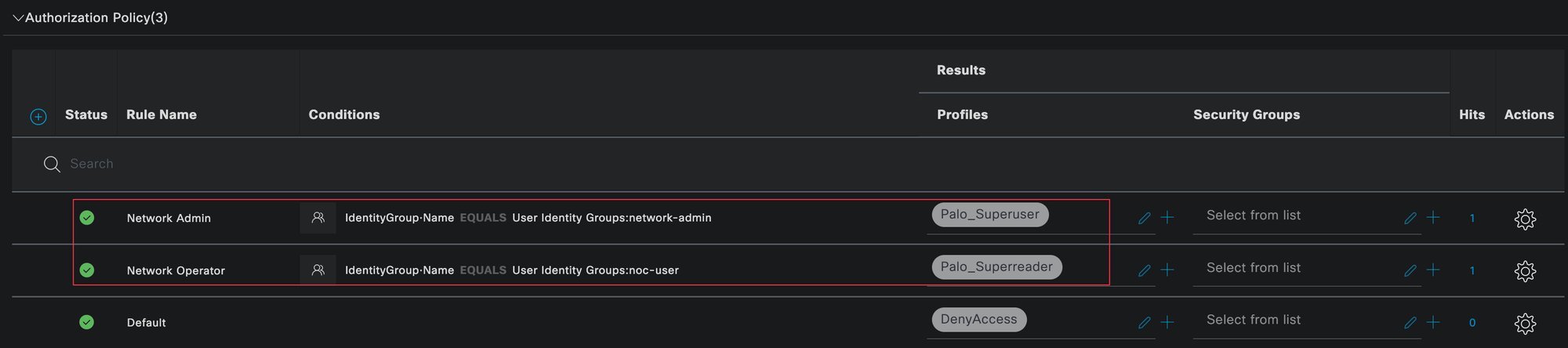 Once authentication is successful, the authorization policy is evaluated. This determines what level of access the user should receive. Here, we match users based on their identity group and return the appropriate authorization profile, which maps the user to either the superuser profile or the superreader profile.