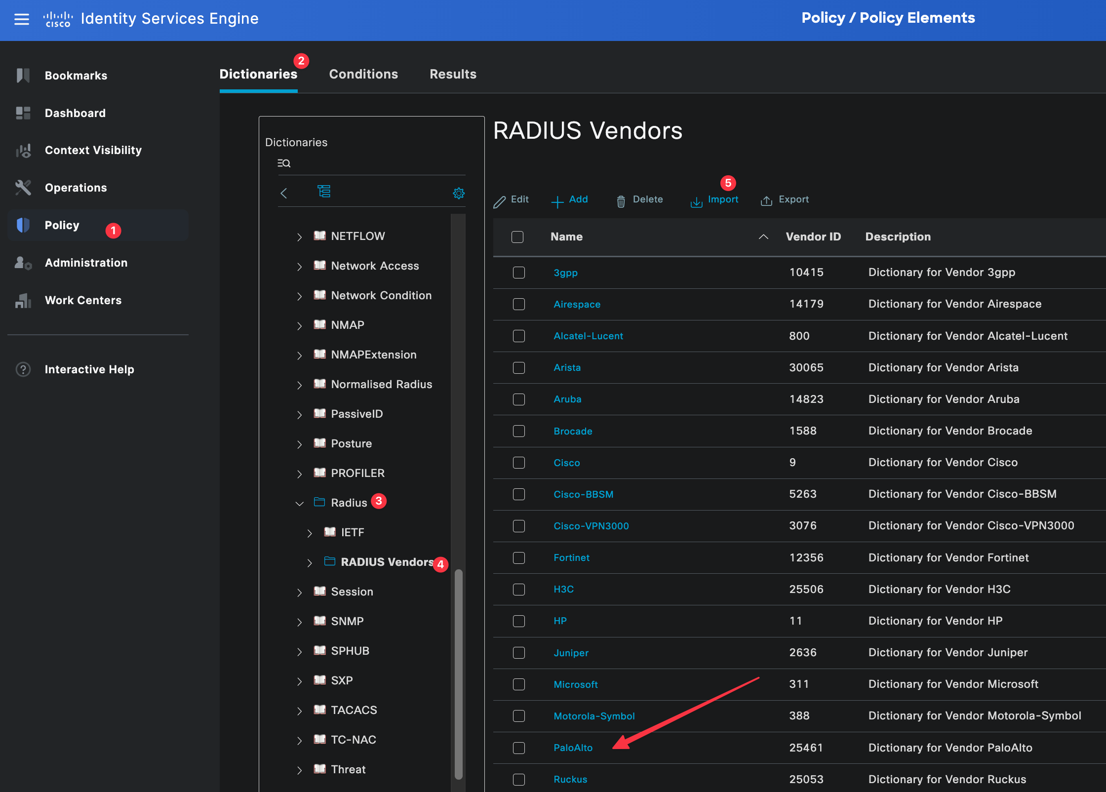 Save this file as dictionary.paloalto and import it into Cisco ISE by navigating to Policy, Policy Elements and Dictionaries. Then, navigate to Radius, select Radius Vendors, and click the Import button.