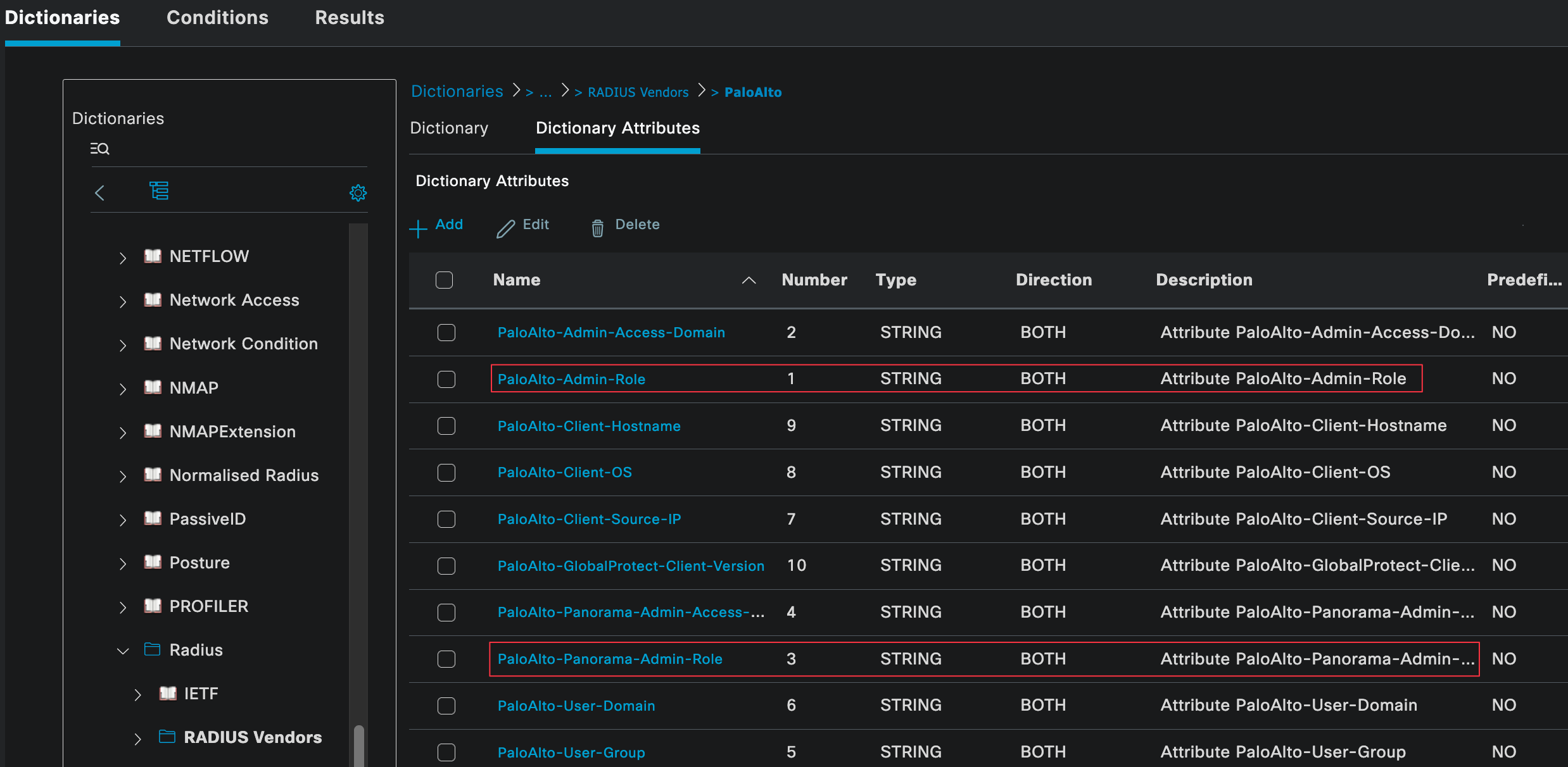 Once imported, it will be listed under Radius Vendors. Out of all the available attributes, the one we will be using is called PaloAlto-Admin-Role (PaloAlto-Panorama-Admin-Role for Panorama). This attribute is used to tell the firewall which admin role should be applied to the user after a successful login.
