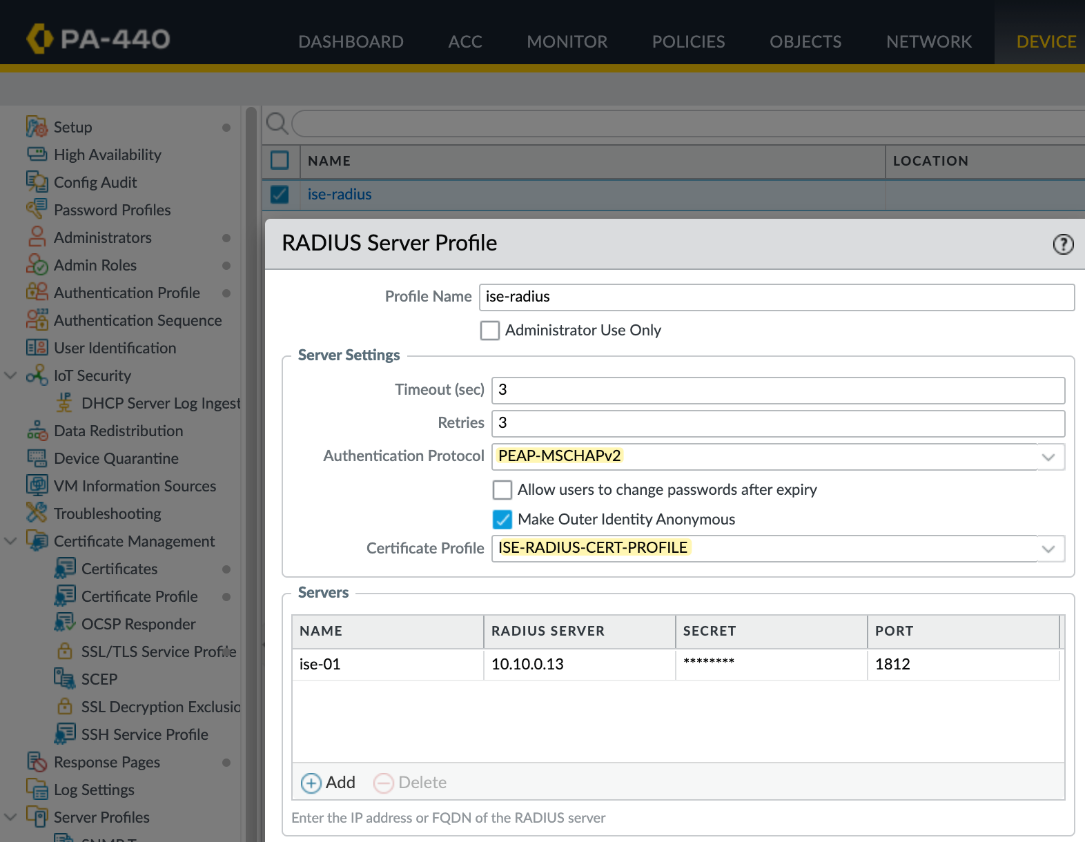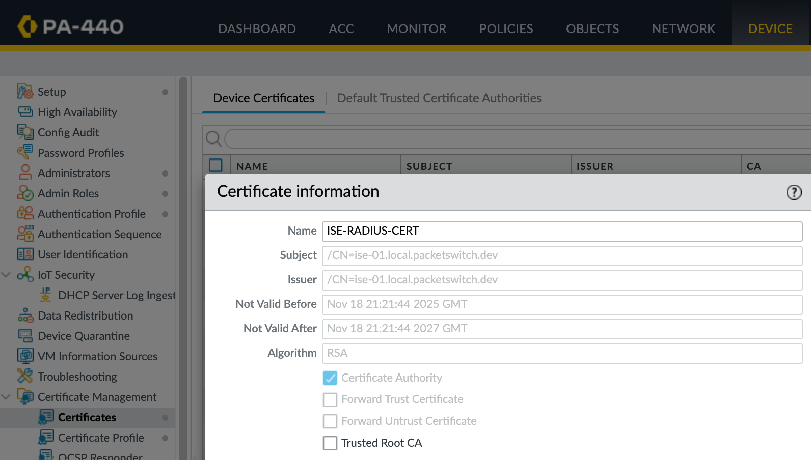 On the firewall, you need to trust the Certificate Authority that issued the Radius server certificate. This is done by importing the CA certificate and referencing it in a certificate profile. In a production environment, you would normally use an internal CA to issue a server certificate for Cisco ISE. The firewall would then trust the CA.