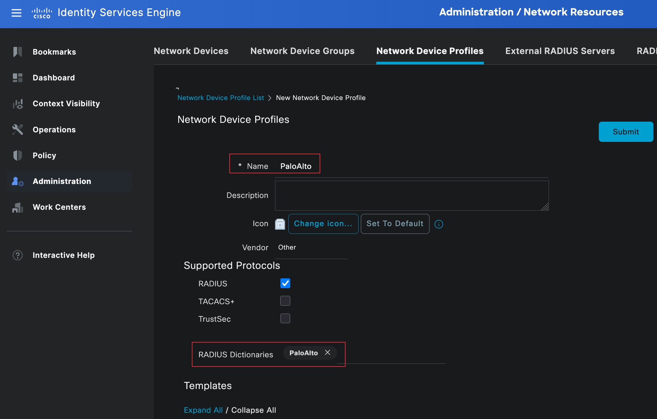 To create one, go to Administration, Network Resources, then Network Device Profiles. From here, you can either use an existing profile (if you have one already for Palo Alto) or create a new one and assign the Palo Alto Radius dictionary we created in the previous step.