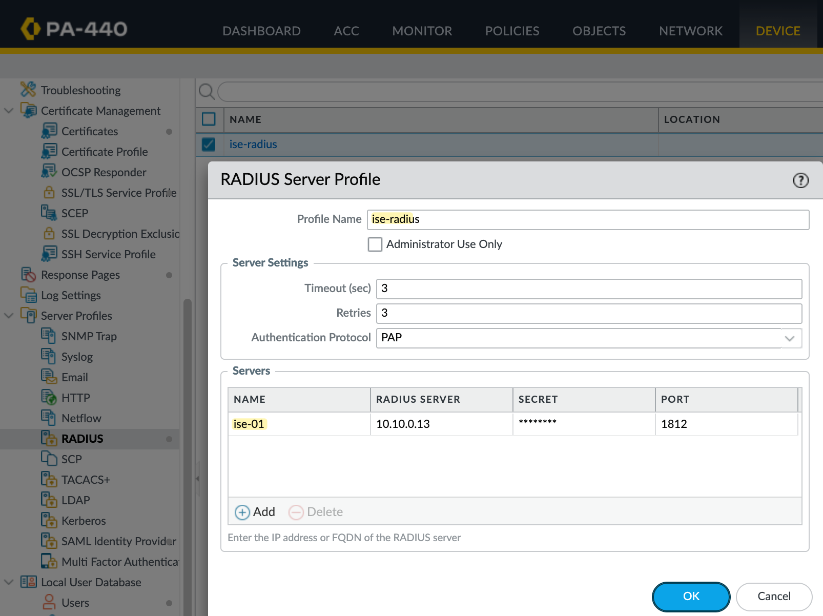 First, add the Radius server on the Palo Alto firewall. Navigate to Device, then Server Profiles, and select Radius. Create a new Radius server profile and give it a name, for example ise-radius. Under server settings, configure the timeout, retries, and authentication protocol, PAP in this case (more on PAP later). In most cases, the default values are fine.