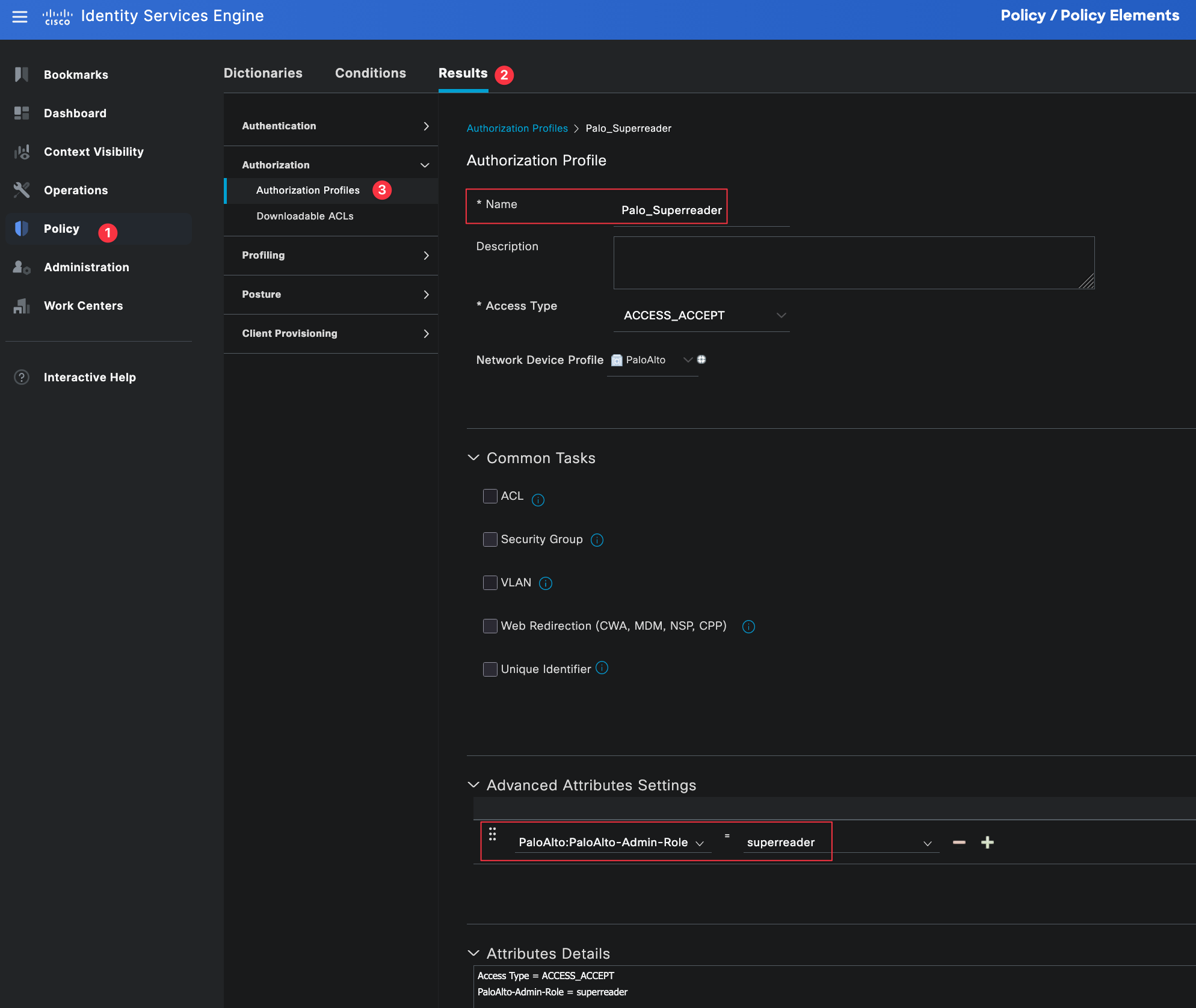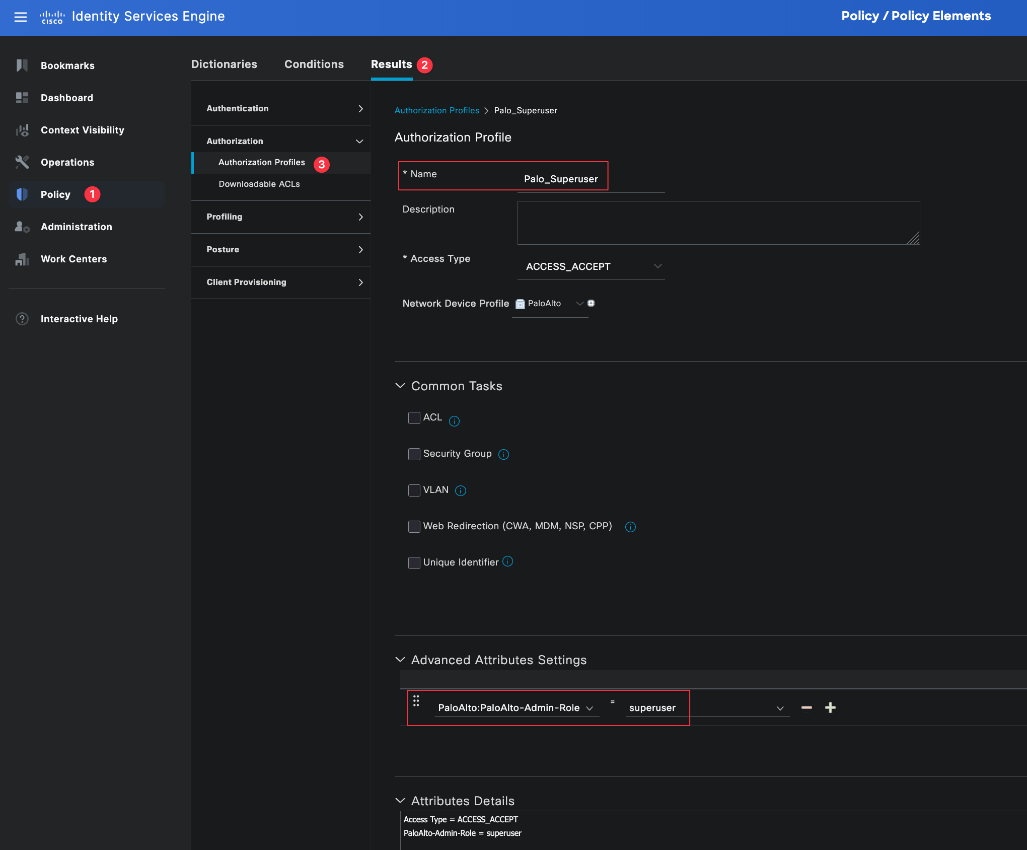 If you create a custom role, you also need to update Cisco ISE. Specifically, you need to create a new authorization profile on ISE and reference the exact name of this custom role. That role name is what ISE will send back to the firewall during login, and it must match what is configured on the Palo Alto firewall.