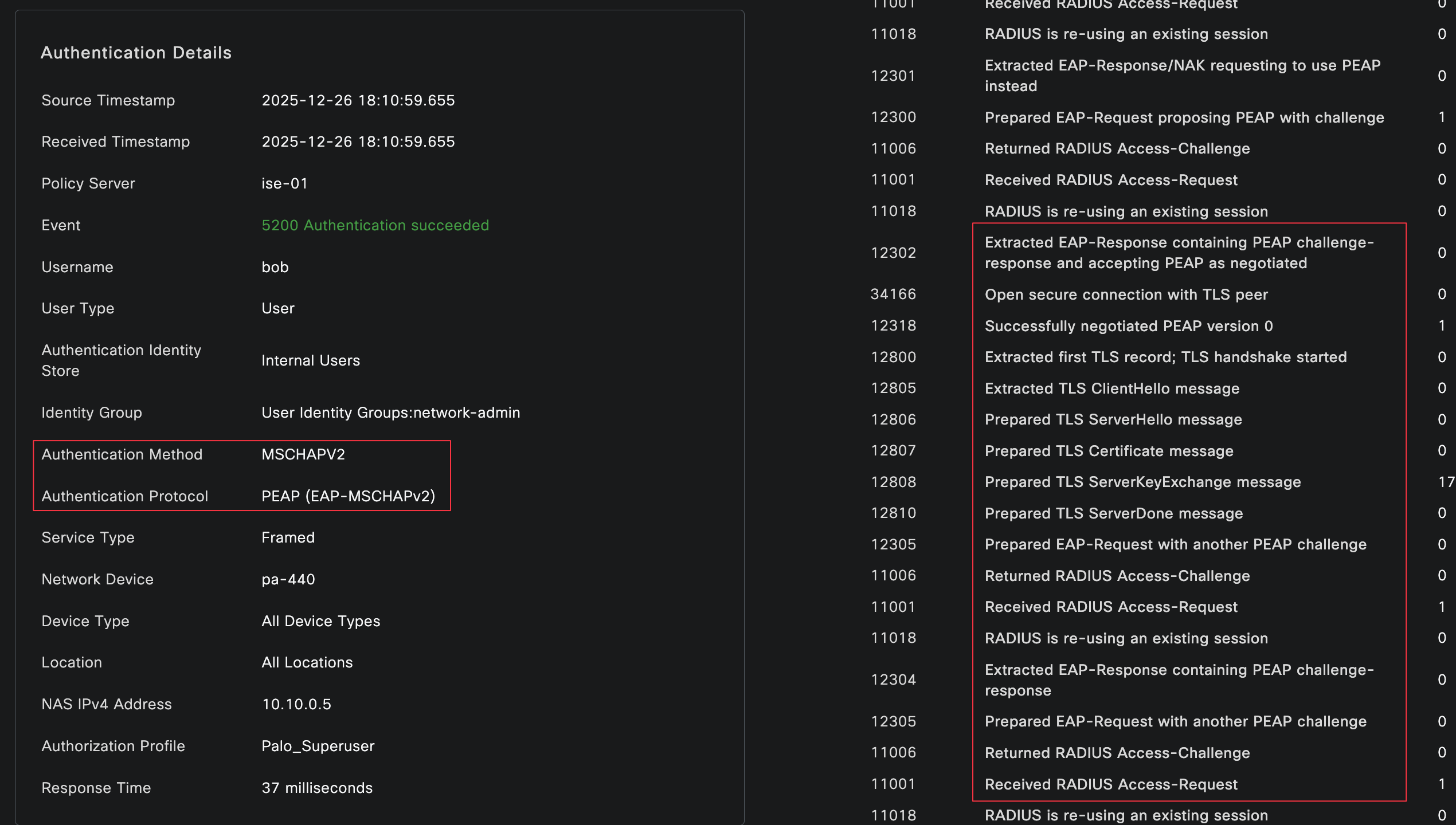 Now, if I reauthenticate, we can see that PEAP MSCHAPv2 is being used by checking the authentication logs on both the firewall and Cisco ISE.