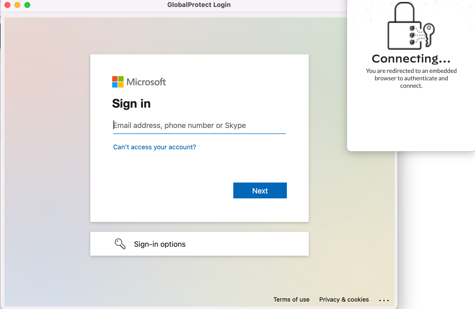 Now it's time for verification. Connect to the GlobalProtect VPN as you would normally do, and you should see the embedded browser window appear for login. Use your email, password, and complete the MFA process, and you're in.