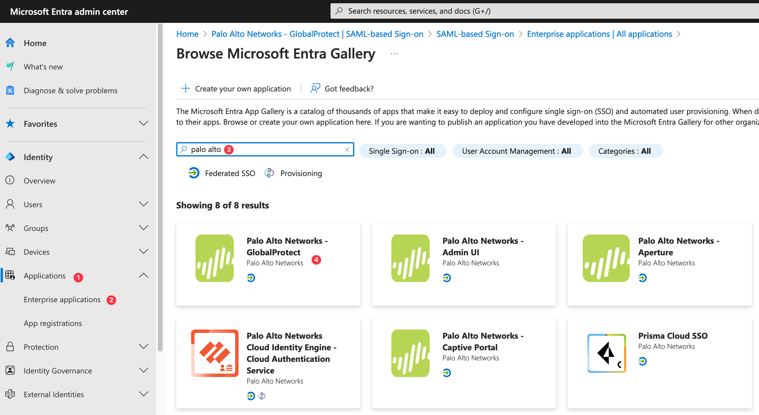 - Once added, select Palo Alto Networks - GlobalProtect > Single sign-on.