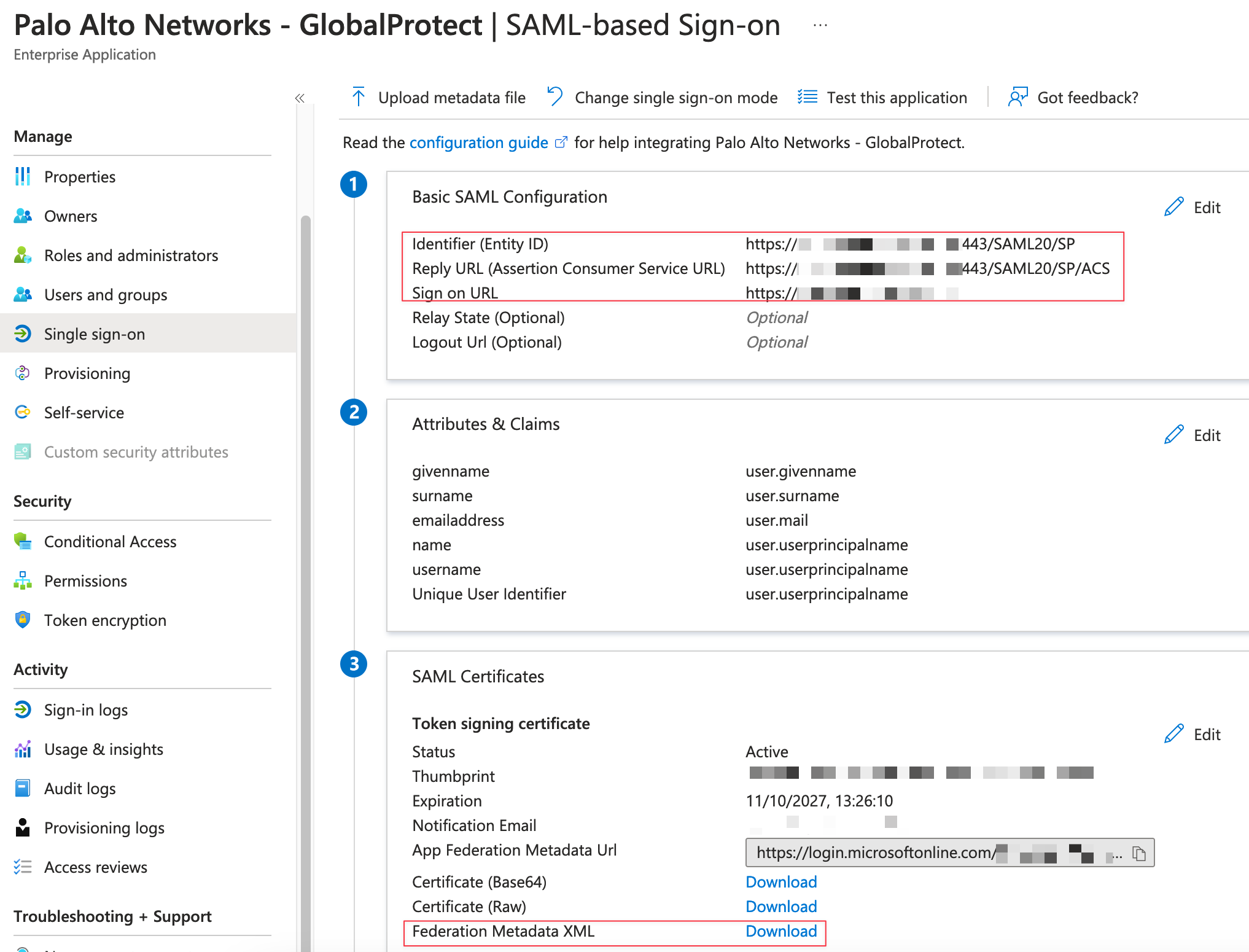 https://<Customer Firewall URL>. - Save your changes and then, under SAML Certificates, download the Federation Metadata XML.