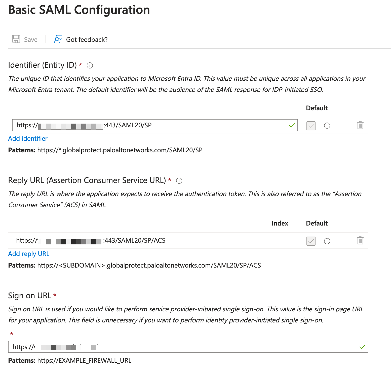 https://<Customer Firewall URL>:443/SAML20/SP. - In the Reply URL (Assertion Consumer Service URL) text box, enter a URL using the following pattern -