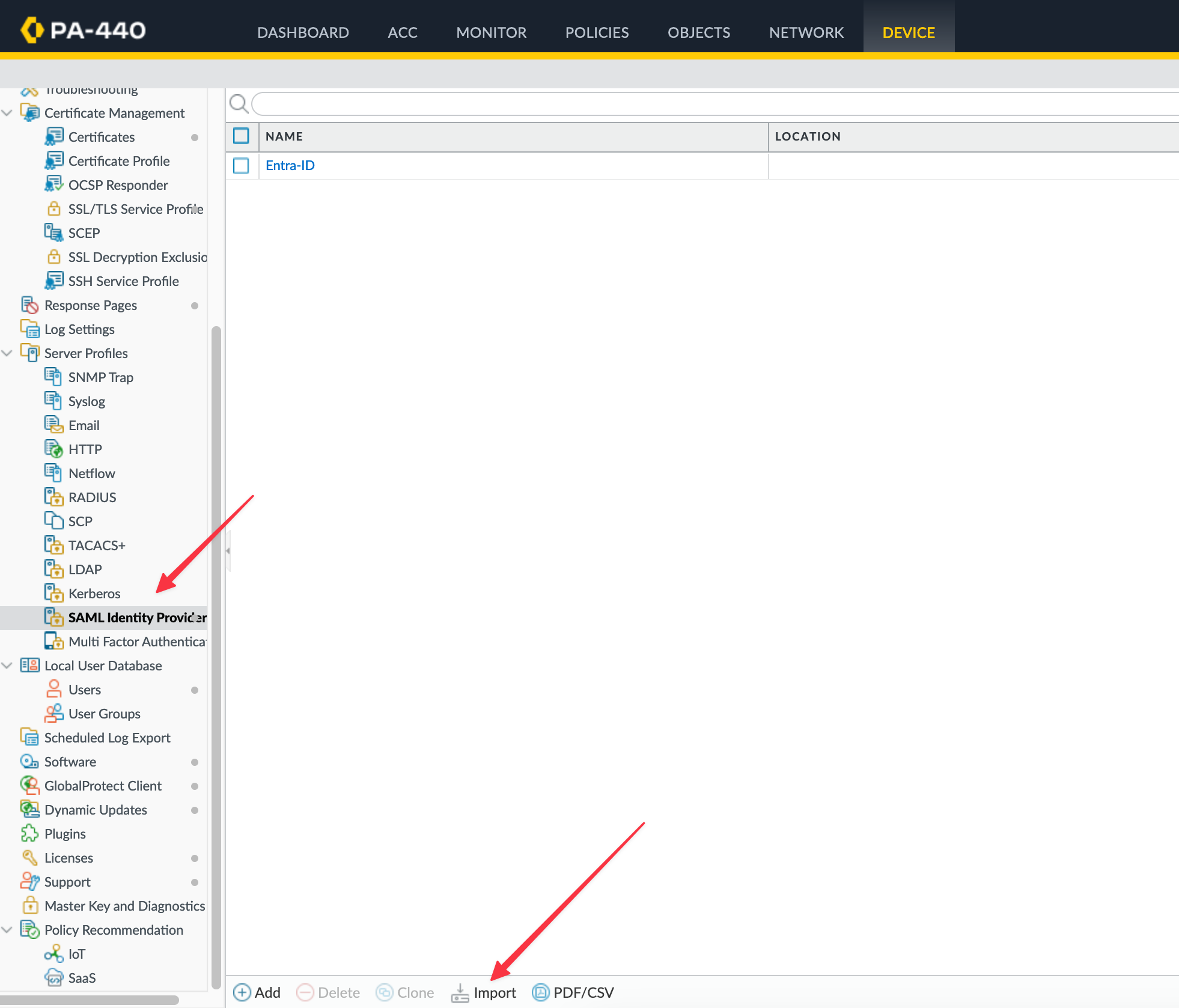 Now let's start the configuration on the Palo Alto side. Navigate to Device > Server Profiles > SAML Identity Provider and import the metadata file we downloaded from the Entra Admin Center.