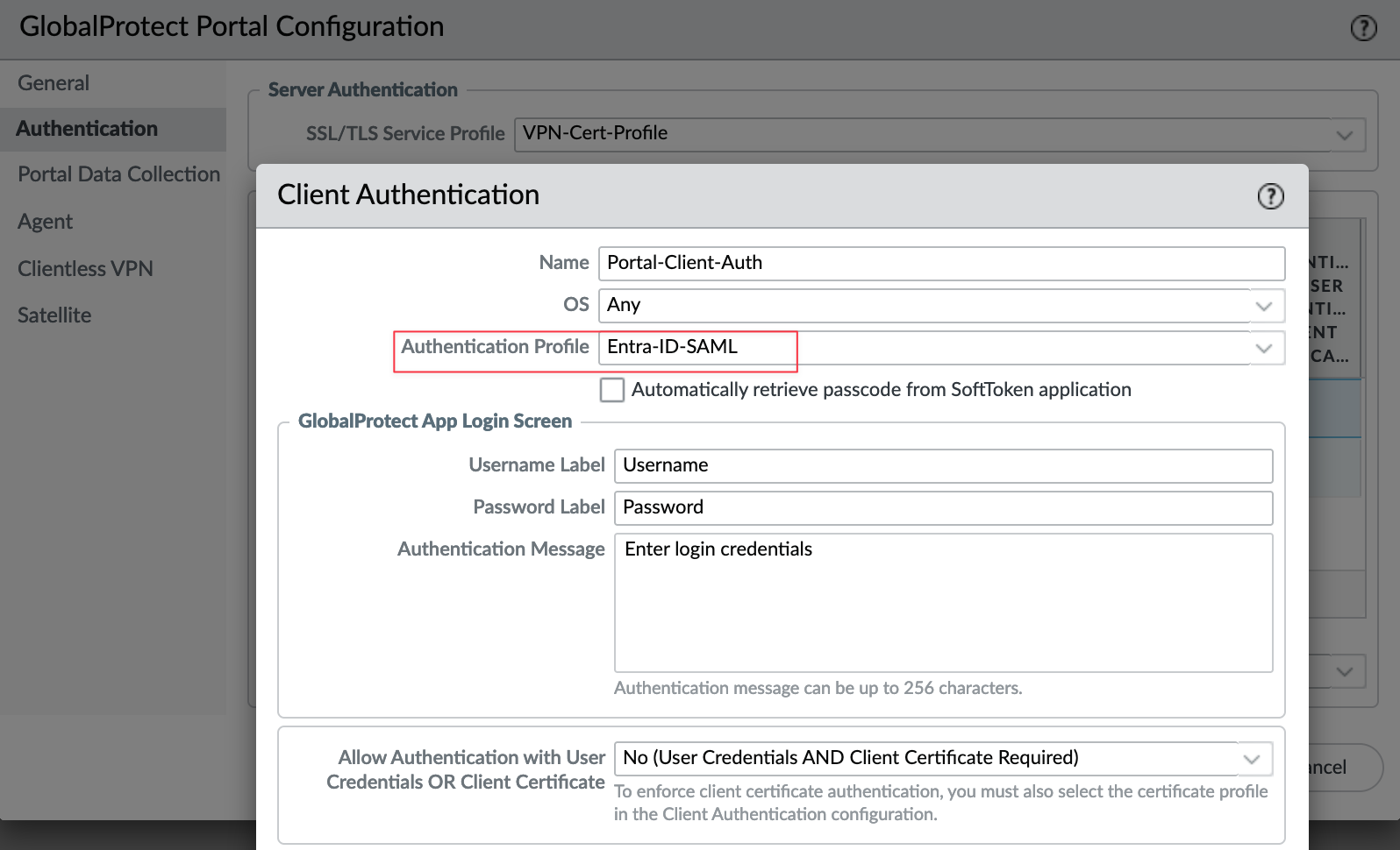 Now, we need to attach the profile to both the GlobalProtect Portal and Gateway. First, navigate to Portal, select your portal, then go to Authentication, and use the authentication profile we just created.