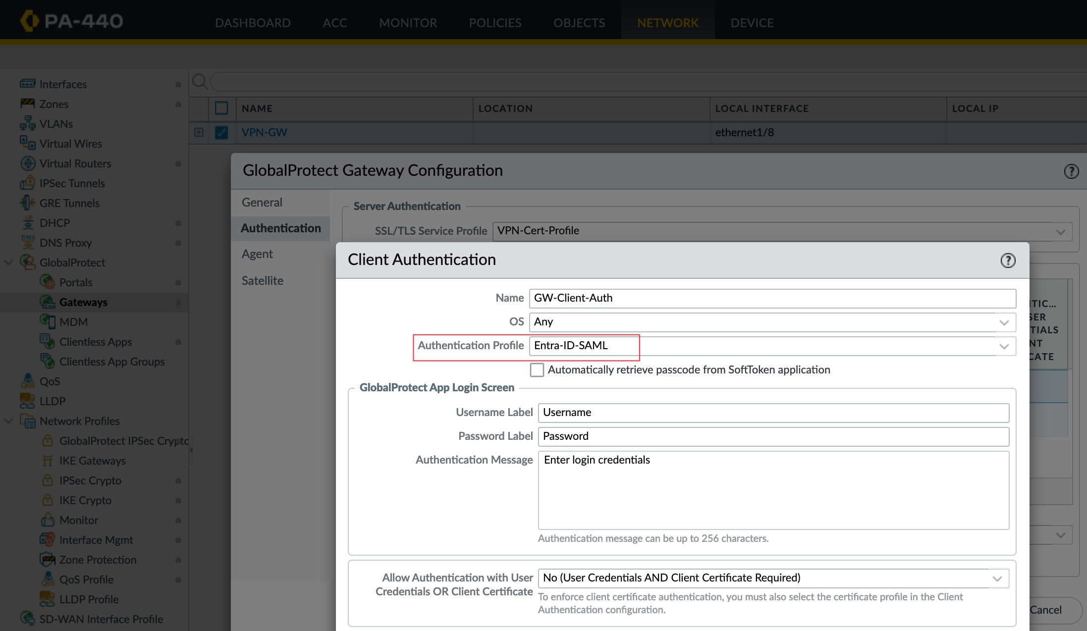 Do the same for the Gateway, navigate to Gateways, select your gateway, and assign the same Authentication Profile.