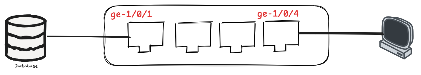 In this example, we have a database server connected to port ge-1/0/1, and we want to mirror all traffic going in and out of this port to port ge-1/0/4, where our laptop is connected. With this setup, we can use Wireshark on the laptop to capture the mirrored traffic.