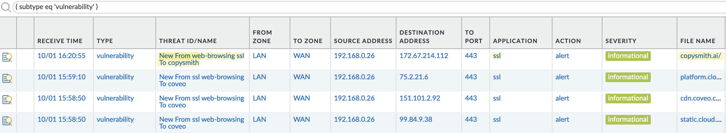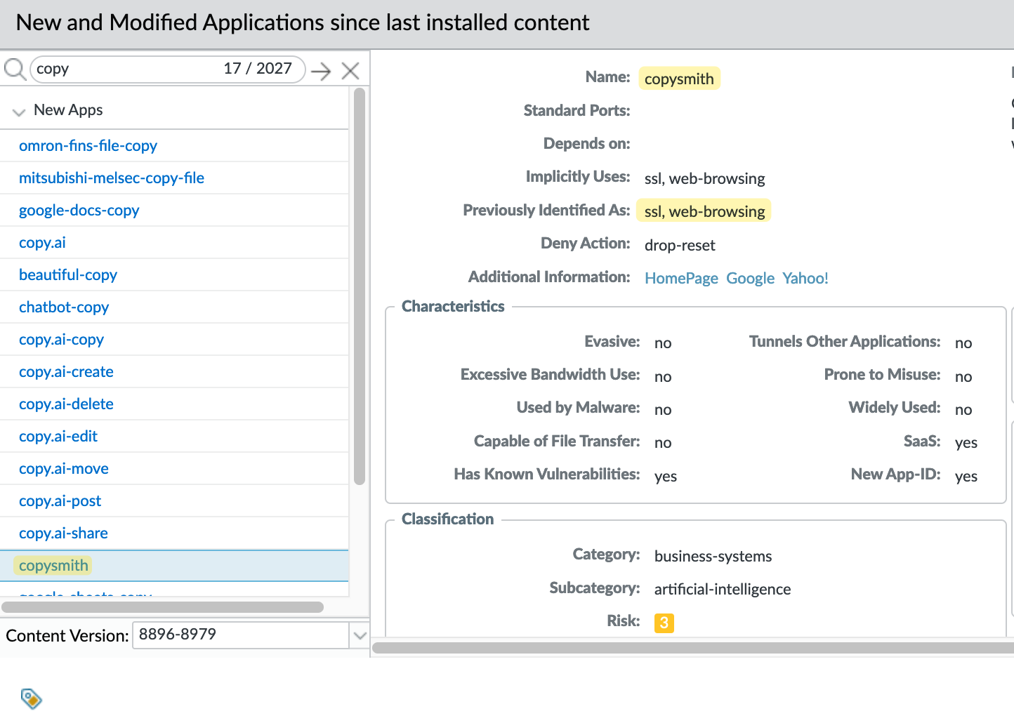 If we look at the Applications and Threats update from September 24th (8896-8979), there are many new and modified App-IDs. One that caught my attention is called ‘copysmith’. To be honest, I had never heard of this App until I saw it here. It appears to be an AI application (ah, not another one, haha). Currently, the application is identified as ‘ssl’, but soon it will be identified specifically as ‘copysmith’.