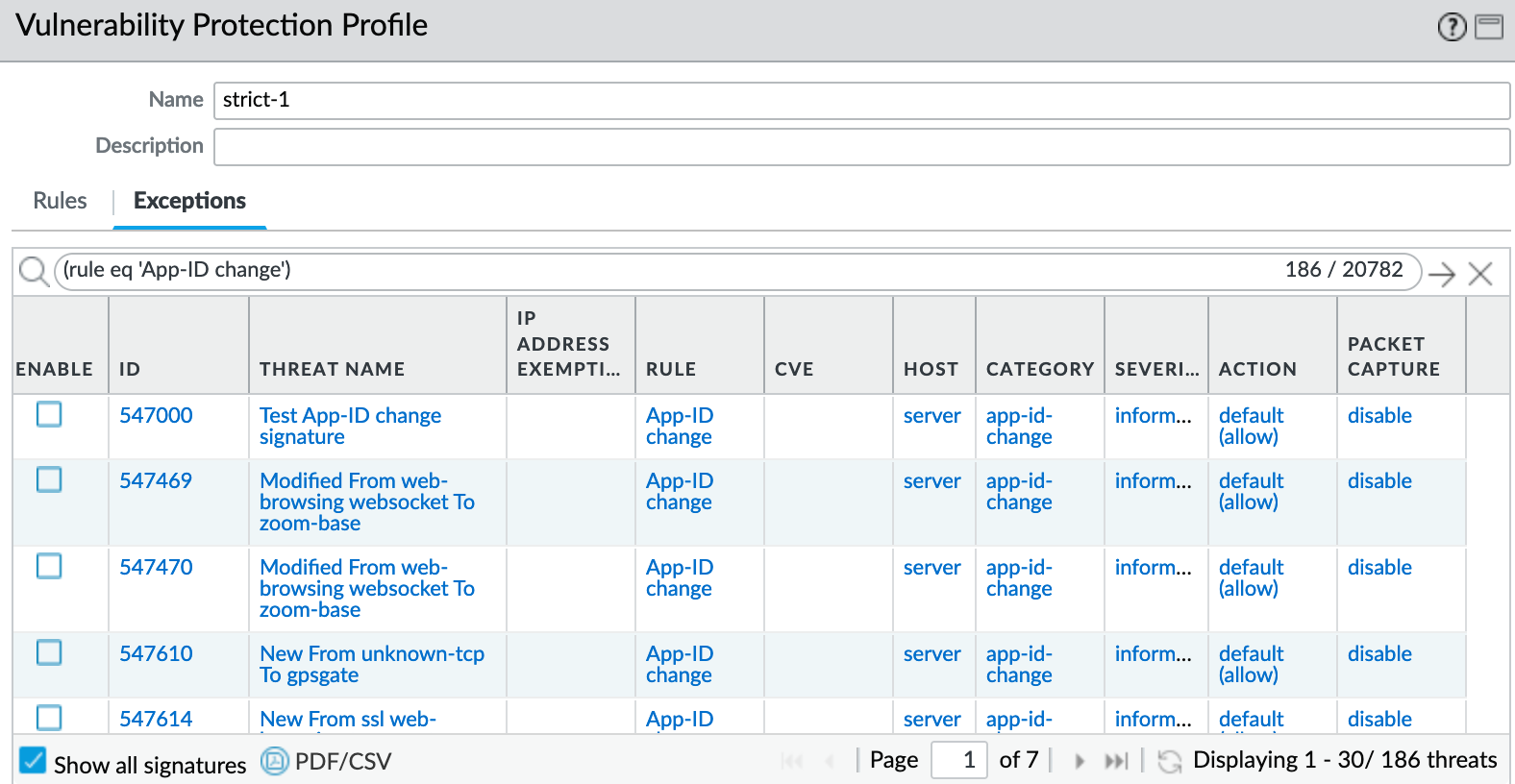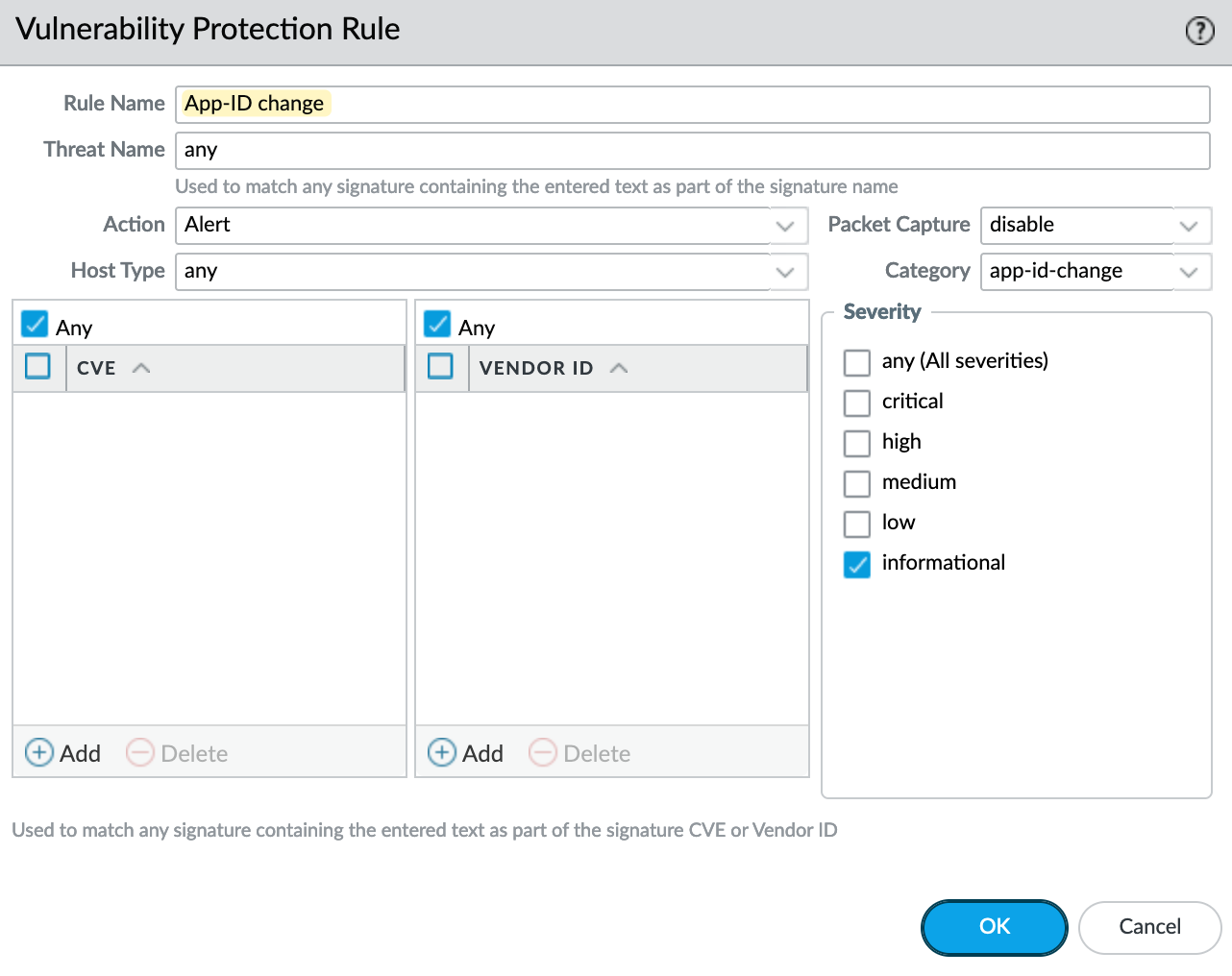 Starting in November 2023, Palo Alto introduced a new Vulnerability Signature category called 'app-id-change', which lists all TSIDs (Threat Signature Indicators). These TSIDs are marked with an “Informational” severity level and the default action is set to “Allow.” They are designed not to block any traffic but to serve the purpose of indicating any traffic that will be affected by upcoming App-ID changes. For further details, you can refer to the official announcement.