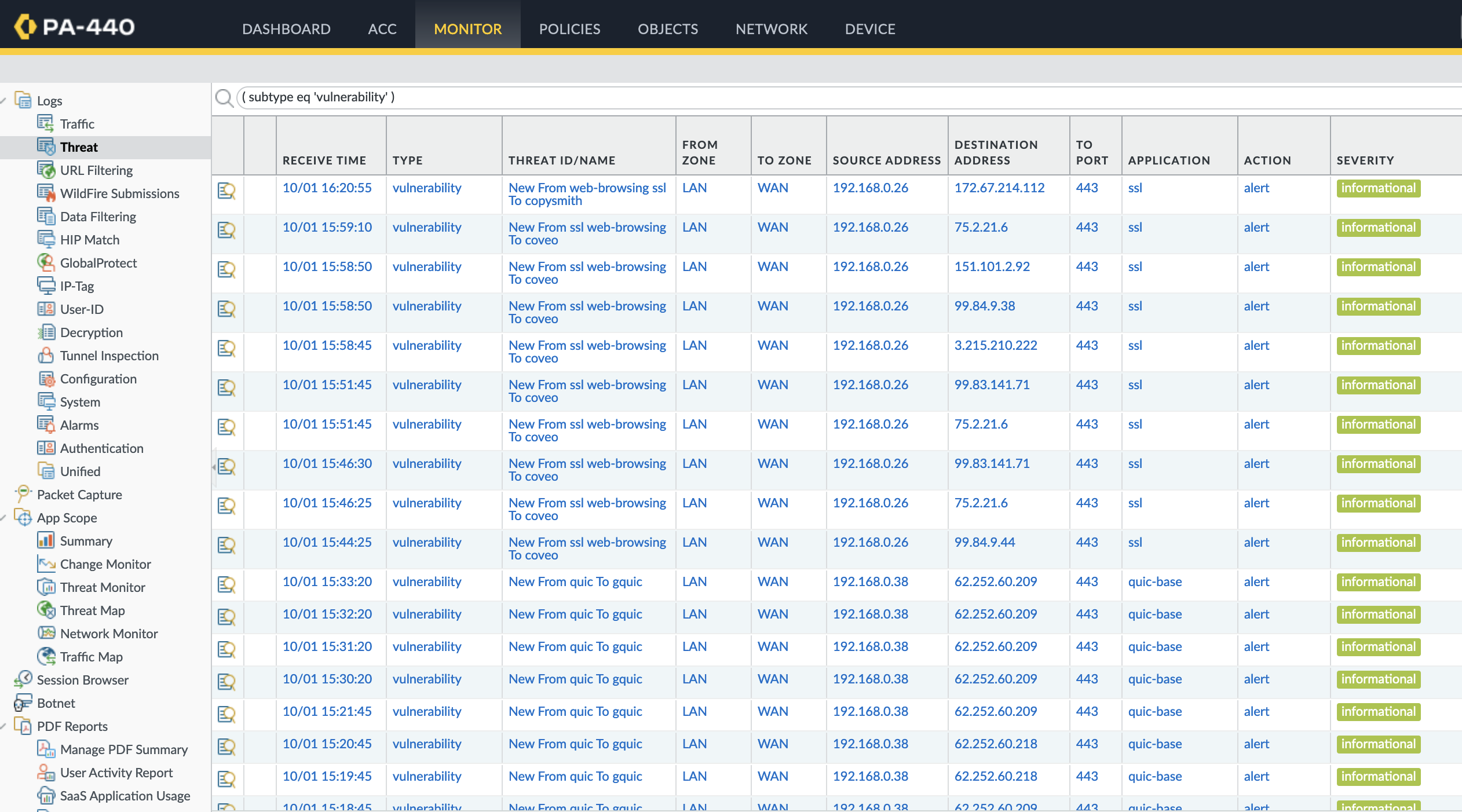 That's all for now. Wait for the traffic to flow and navigate to Monitor > Threat to view all the possible App-ID changes.