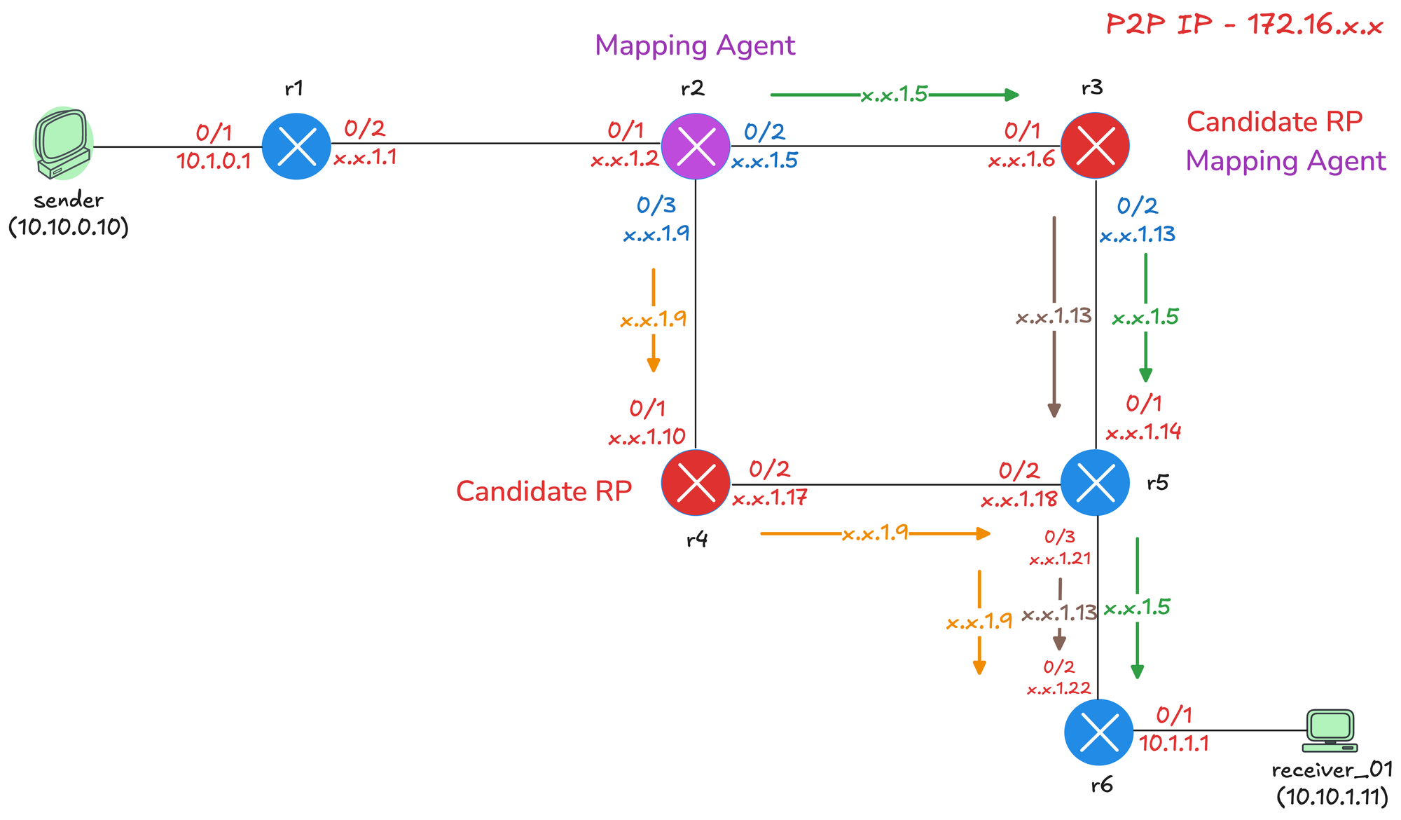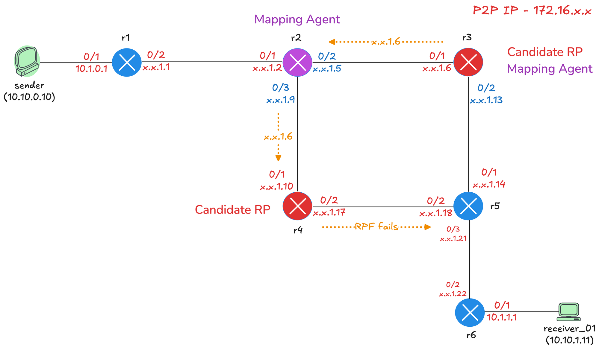 We will use a slightly modified diagram from the previous post, and here, we will make both r3 and r4 Candidate RPs, and we will also make r3 the Mapping Agent, just to show you that one router can serve both roles and also make r2 the Mapping Agent.