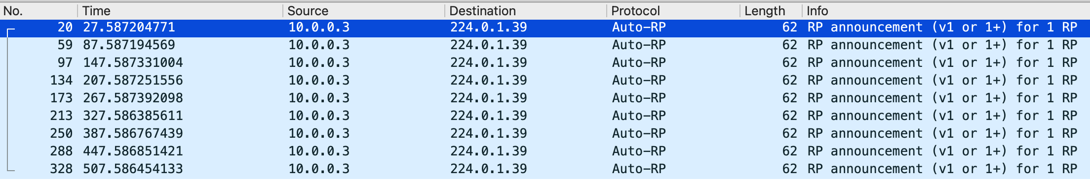 (10.0.0.3, 224.0.1.39), 00:01:47/00:02:12, flags: PT