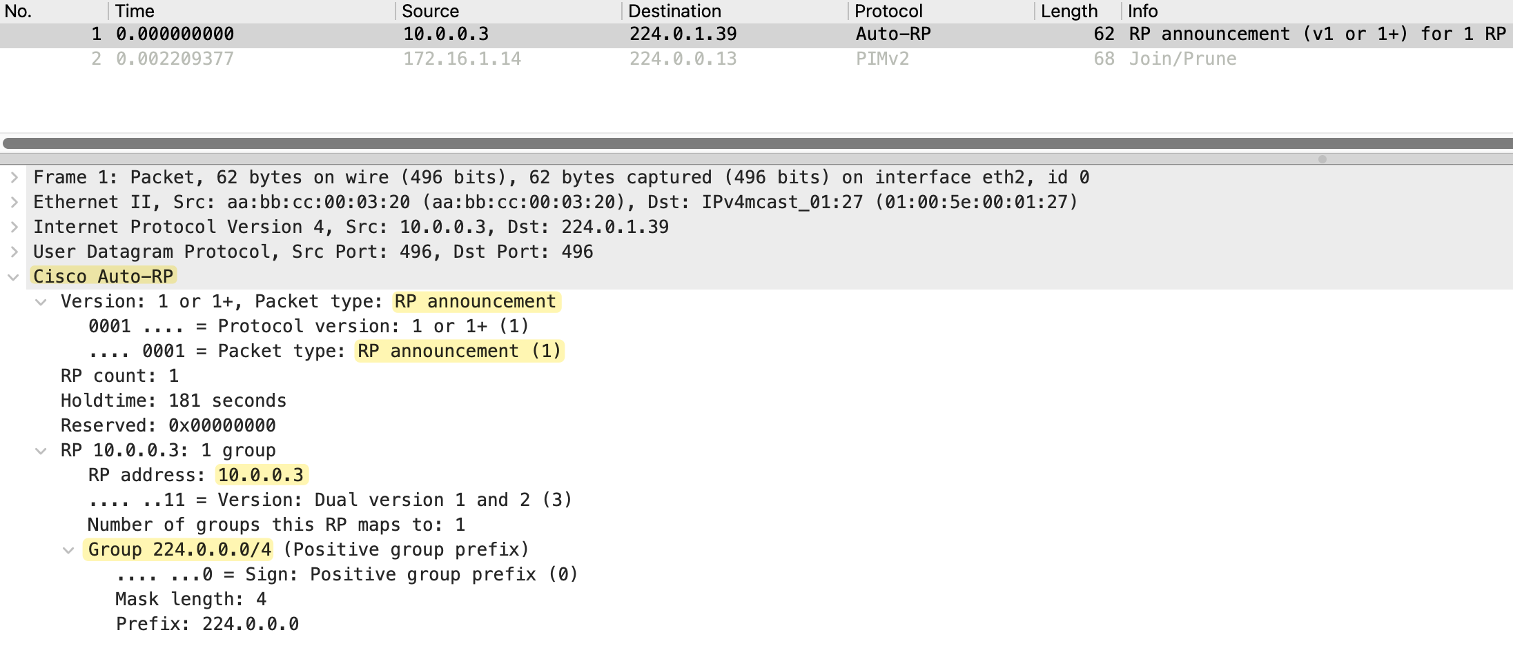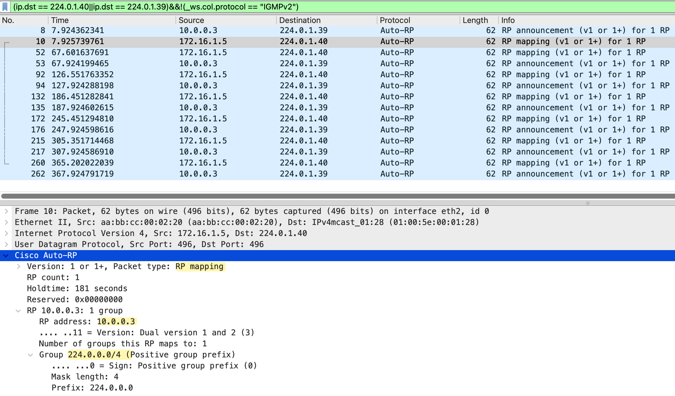 Looking at the packet capture, we can see both message types. The RP announcement messages from 10.0.0.3 (r3) going to 224.0.1.39, and the RP mapping messages from 172.16.1.5 (r2) going to 224.0.1.40. The RP mapping packet shows the packet type as "RP mapping", with the RP address 10.0.0.3 and the group range 224.0.0.0/4.