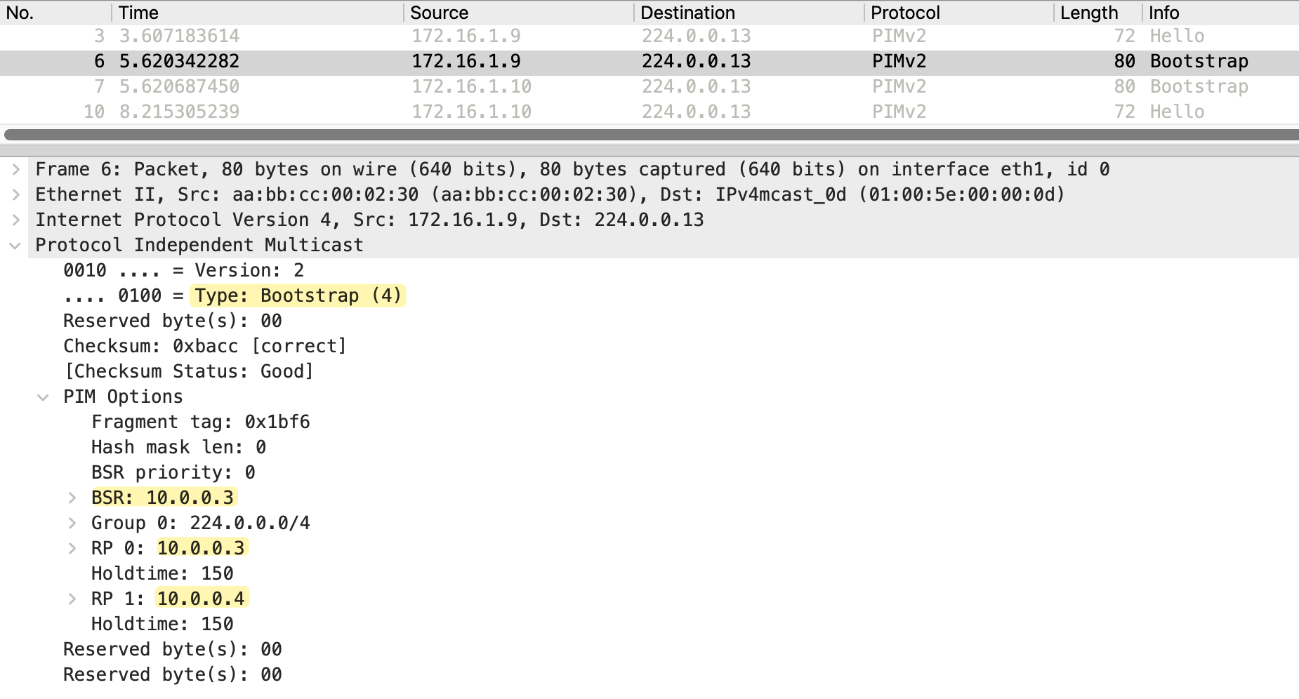 As soon as we configure the BSR candidates, r2 and r3 start sending bootstrap messages (every 60 seconds) out of all PIM-enabled interfaces. These messages are sent to the All-PIM-Routers address 224.0.0.13 with a TTL of 1, so they only reach directly connected PIM neighbors. Each neighbor receives the message, processes it, and floods it out all other PIM-enabled interfaces.