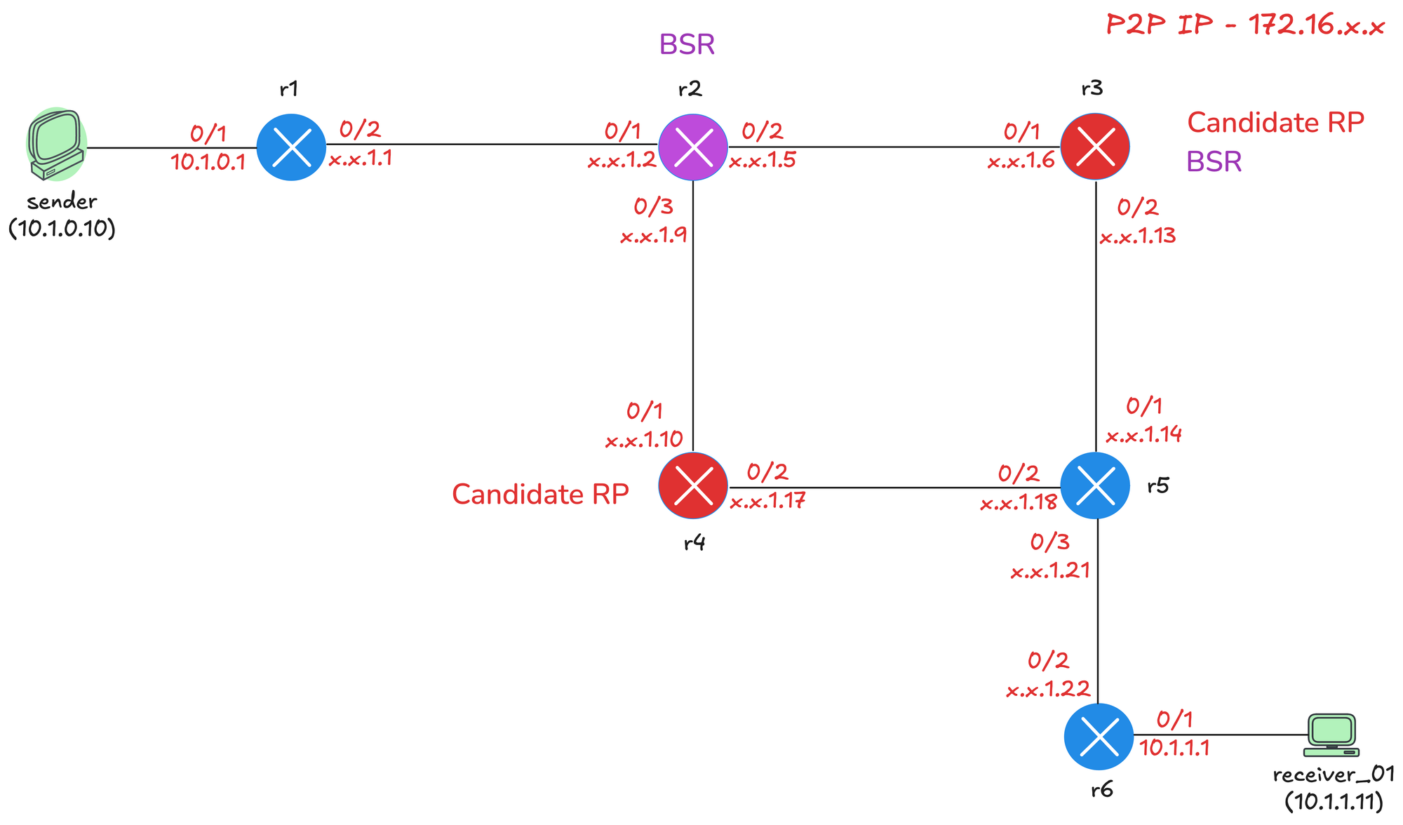 For this lab, r3 will act as both the BSR and a Candidate RP. We will also configure r2 as a second BSR for redundancy, and r4 as a second Candidate RP so we can see how the RP selection process works when multiple candidates exist.