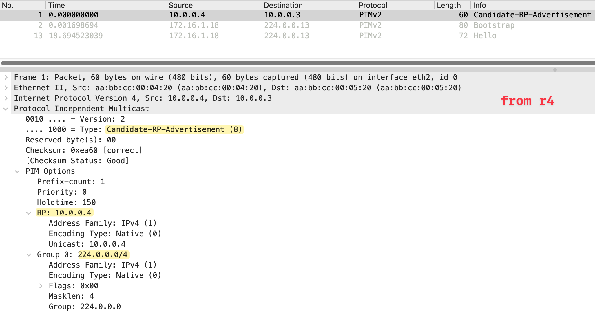 Expires: 00:01:57Once the Candidate RPs are configured, r3 and r4 start sending unicast Candidate RP advertisement messages to the BSR. These messages contain the RP address and the group ranges the RP is willing to serve. Since we did not specify a group-list, both r3 and r4 advertise themselves as candidates for all multicast groups.
