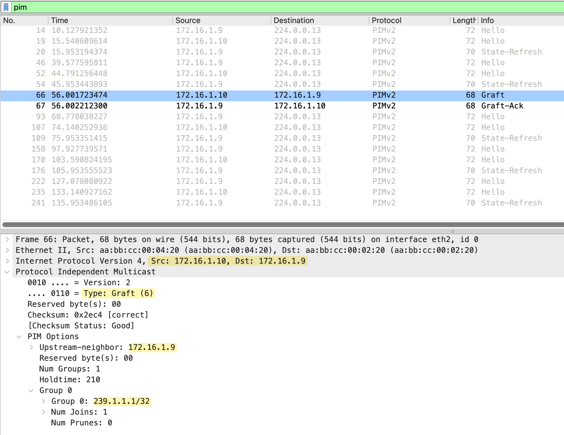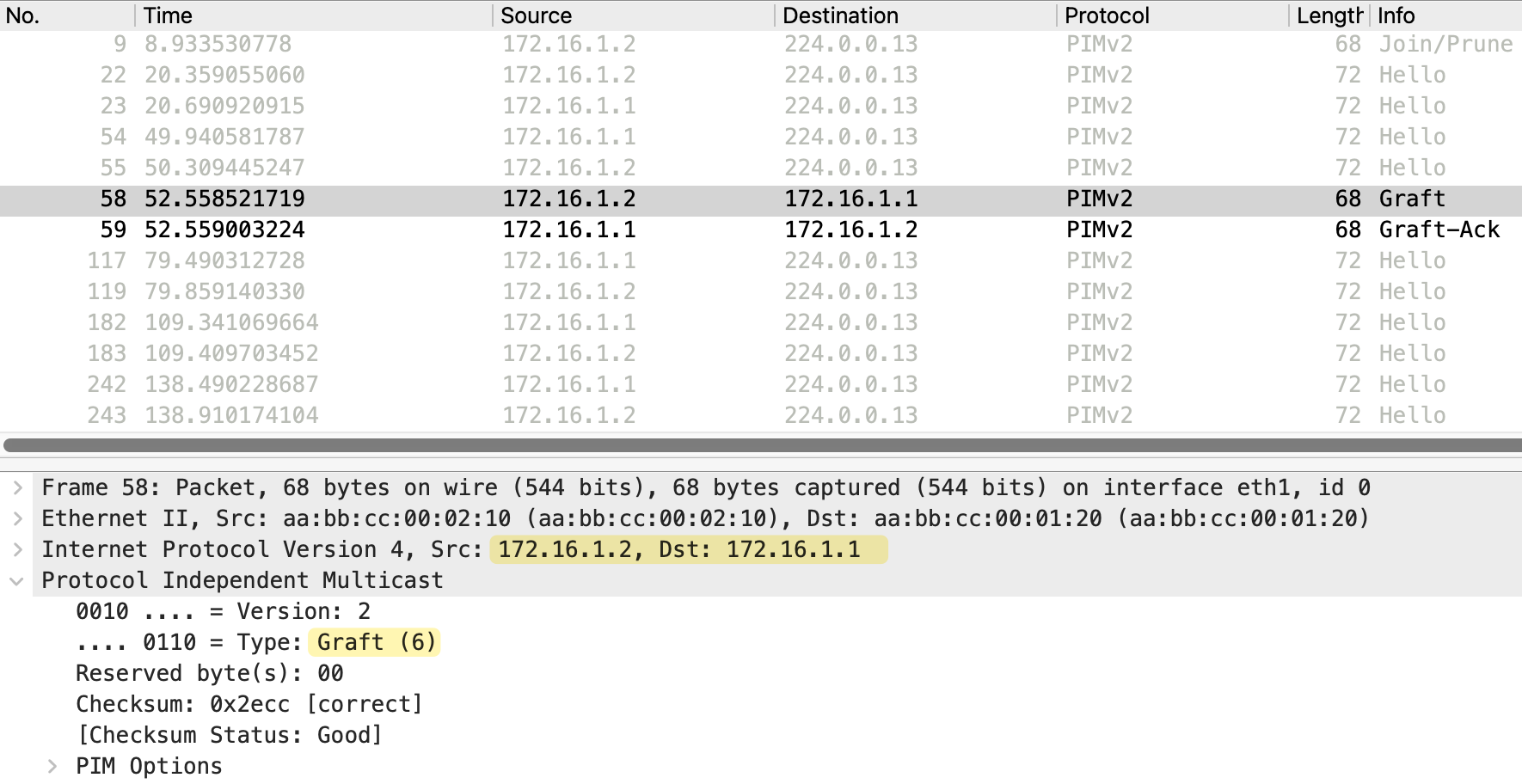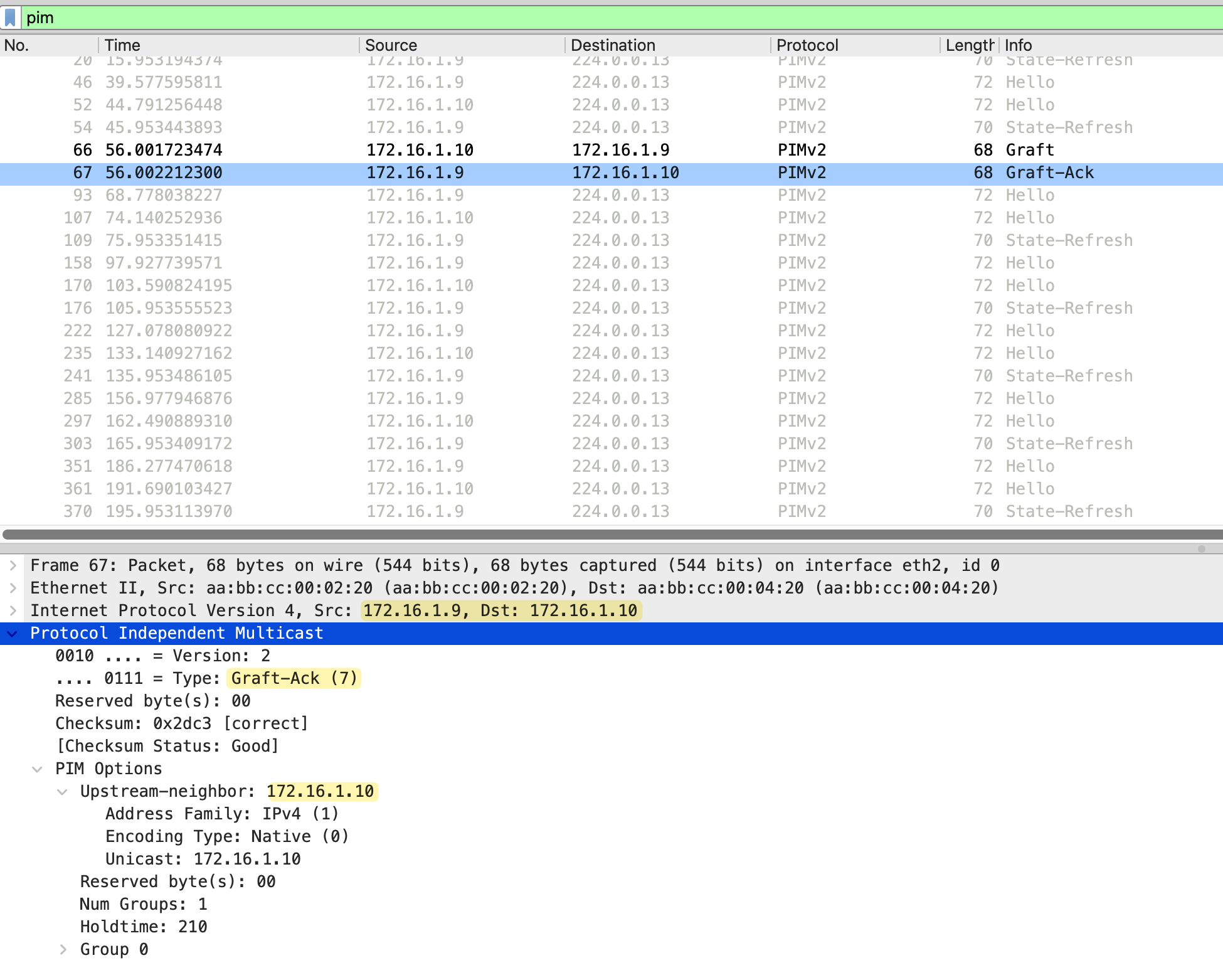 Immediately after receiving the Graft, r2 responds with a Graft-Ack message. This is sent from 172.16.1.9 (r2) back to 172.16.1.10 (r4). The message type is Graft-Ack (7), confirming that r2 has received the Graft and will resume forwarding multicast traffic to r4.