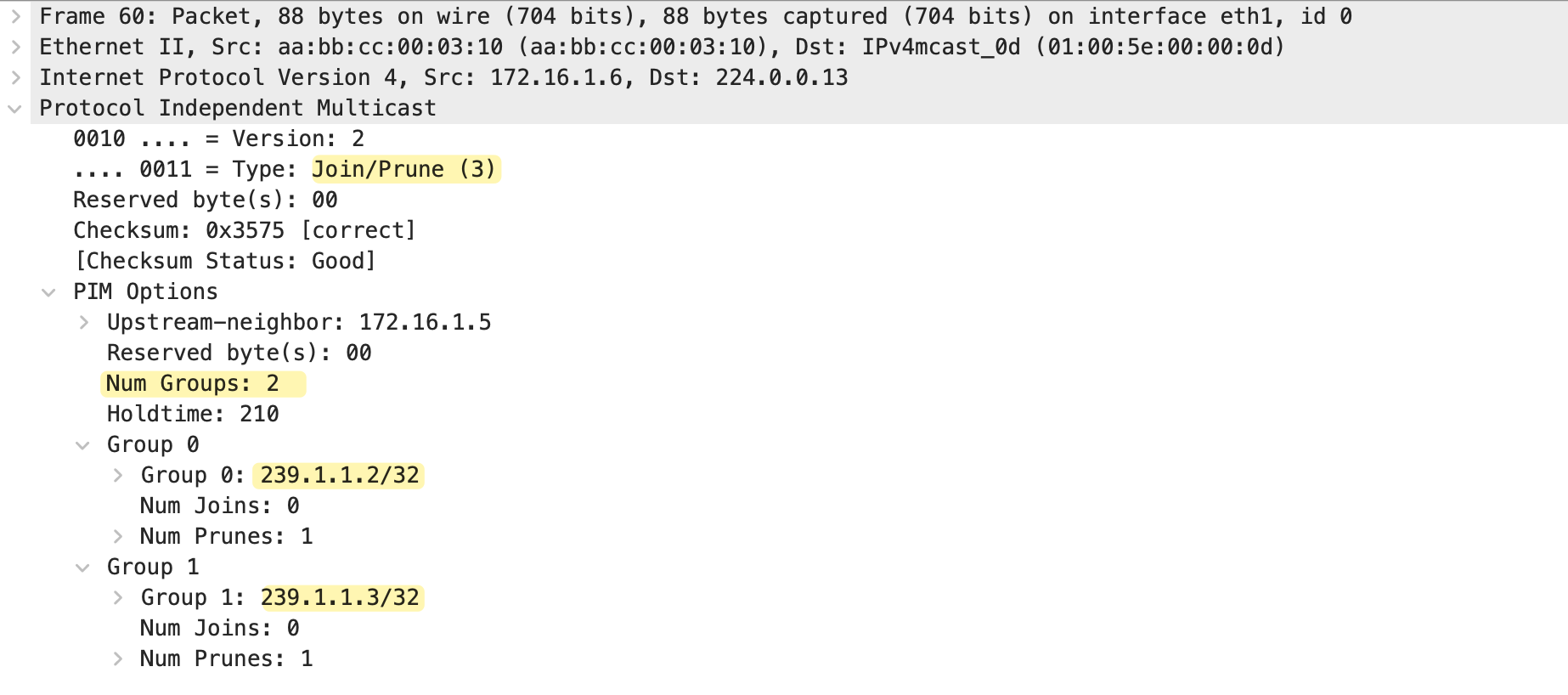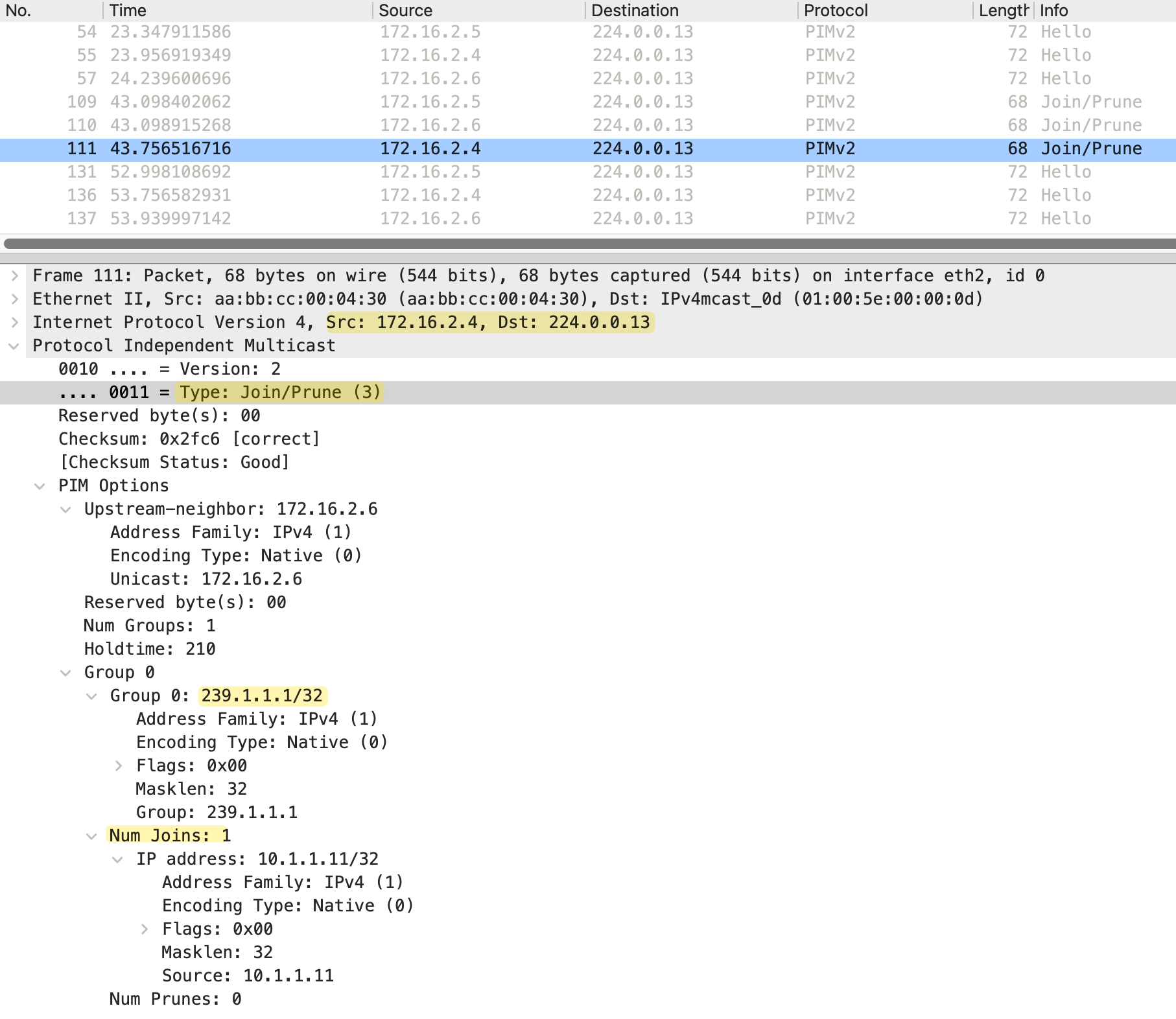 A single Join/Prune message can also contain multiple groups. In the packet capture above, we can see Num Groups is set to 2. The message includes