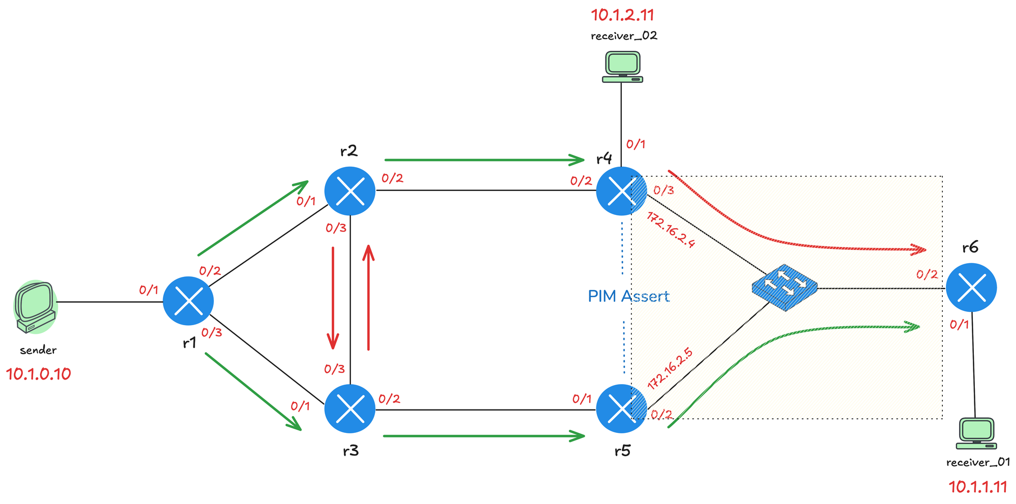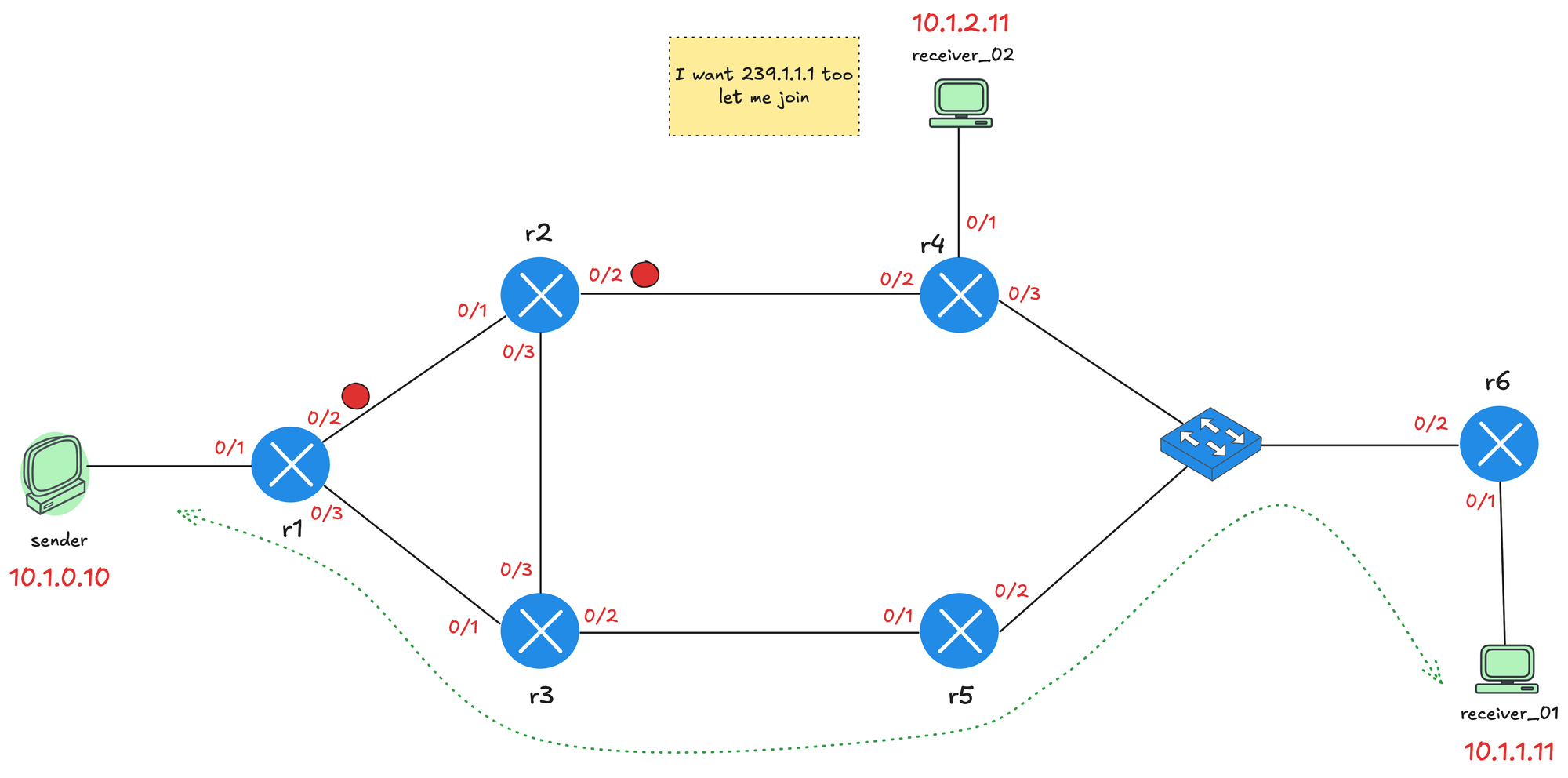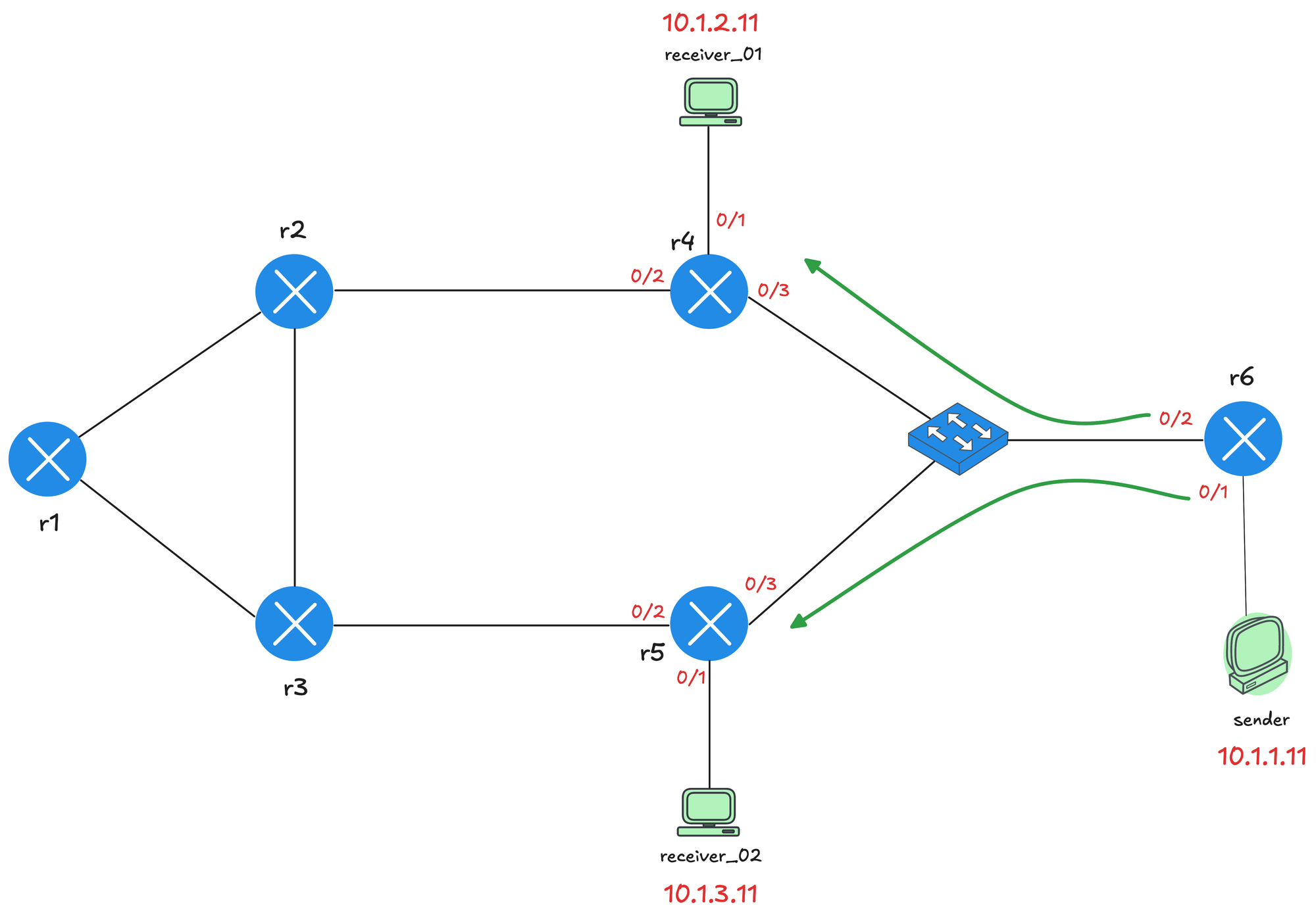 We made a small adjustment to the topology and moved the sender behind r6. Both receiver_01 and receiver_02 have joined the multicast group, and r6 is forwarding traffic toward both r4 and r5 through the shared switch segment.
