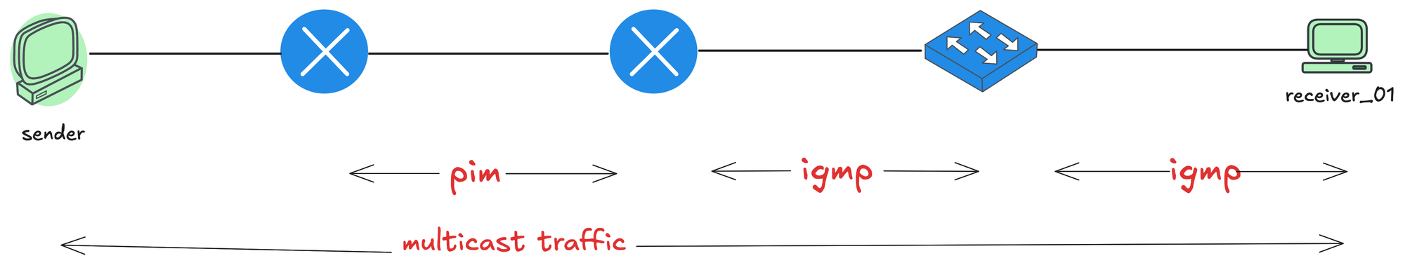 Let's now add a receiver to the mix. First, I am going to make receiver_01 join the multicast group 239.1.1.1, but I am not going to send any multicast traffic from the sender yet, just to see what happens. I will also add the same diagram here so, you don't have to scroll all the way back 😄