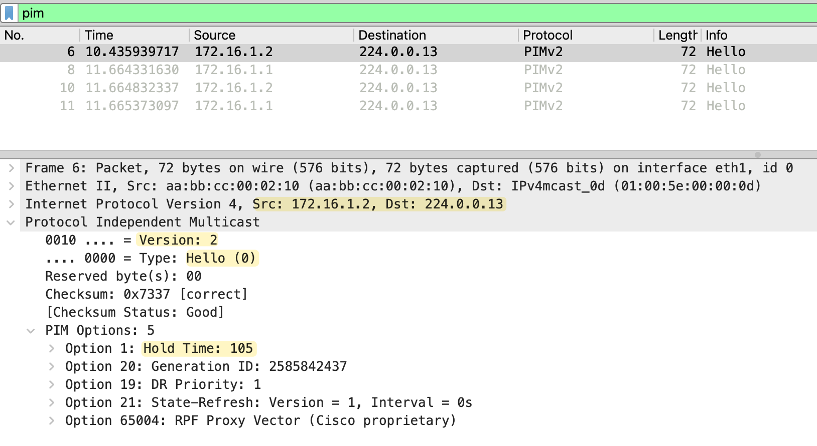 As soon as PIM is enabled, the routers start sending Hello messages to 224.0.0.13. In the packet capture below, you can see both routers (172.16.1.1 and 172.16.1.2) exchanging Hello messages.