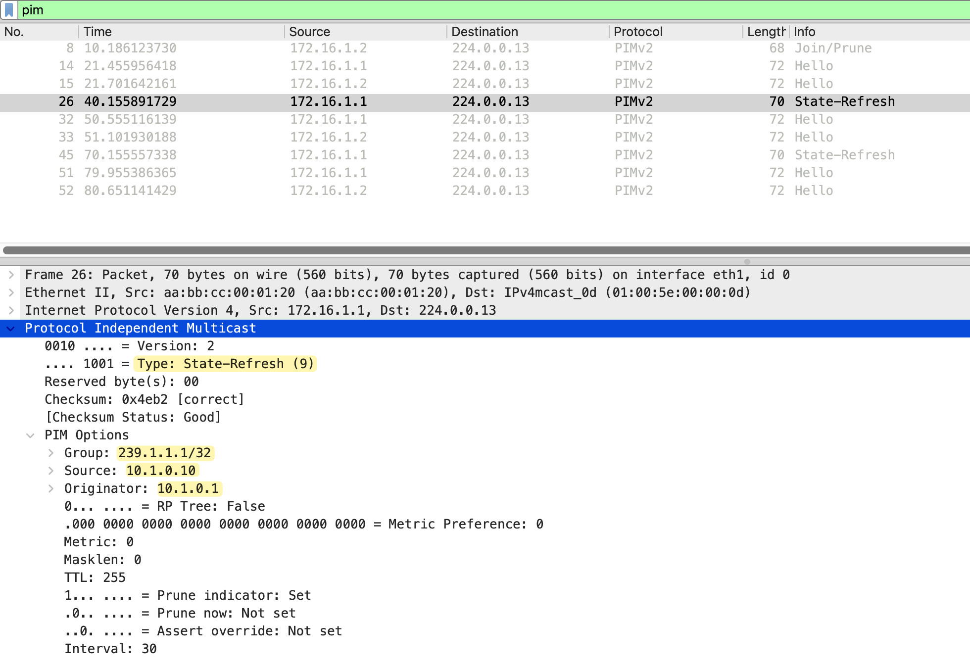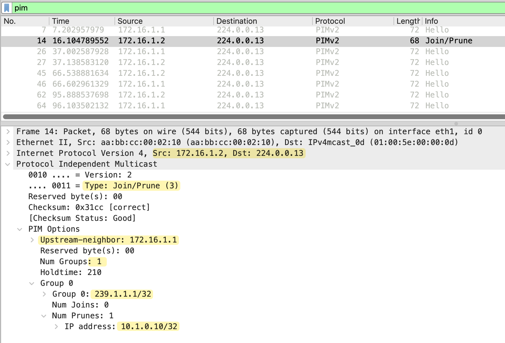 As we briefly mentioned earlier, PIM does not have separate message types for Join and Prune. Instead, it uses a single Join/Prune message that can carry both join and prune information in the same packet. This is the same message format we saw earlier when looking at the Prune packet capture.