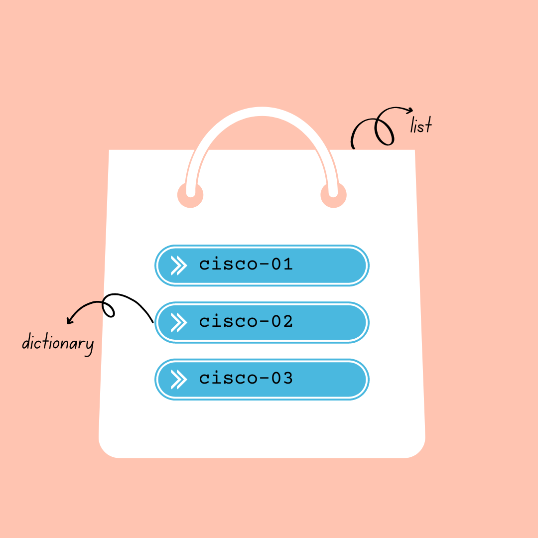 In Part-1, we defined the device parameters in a Python Dictionary and pass them to the Netmiko ConnectHandler. The same concept applies here, the only difference here is that we will have a list of dictionaries. Each dictionary within the list contains the device parameters. Below is my poor attempt to visualise where the list called device_list contains the dictionaries of all three devices.