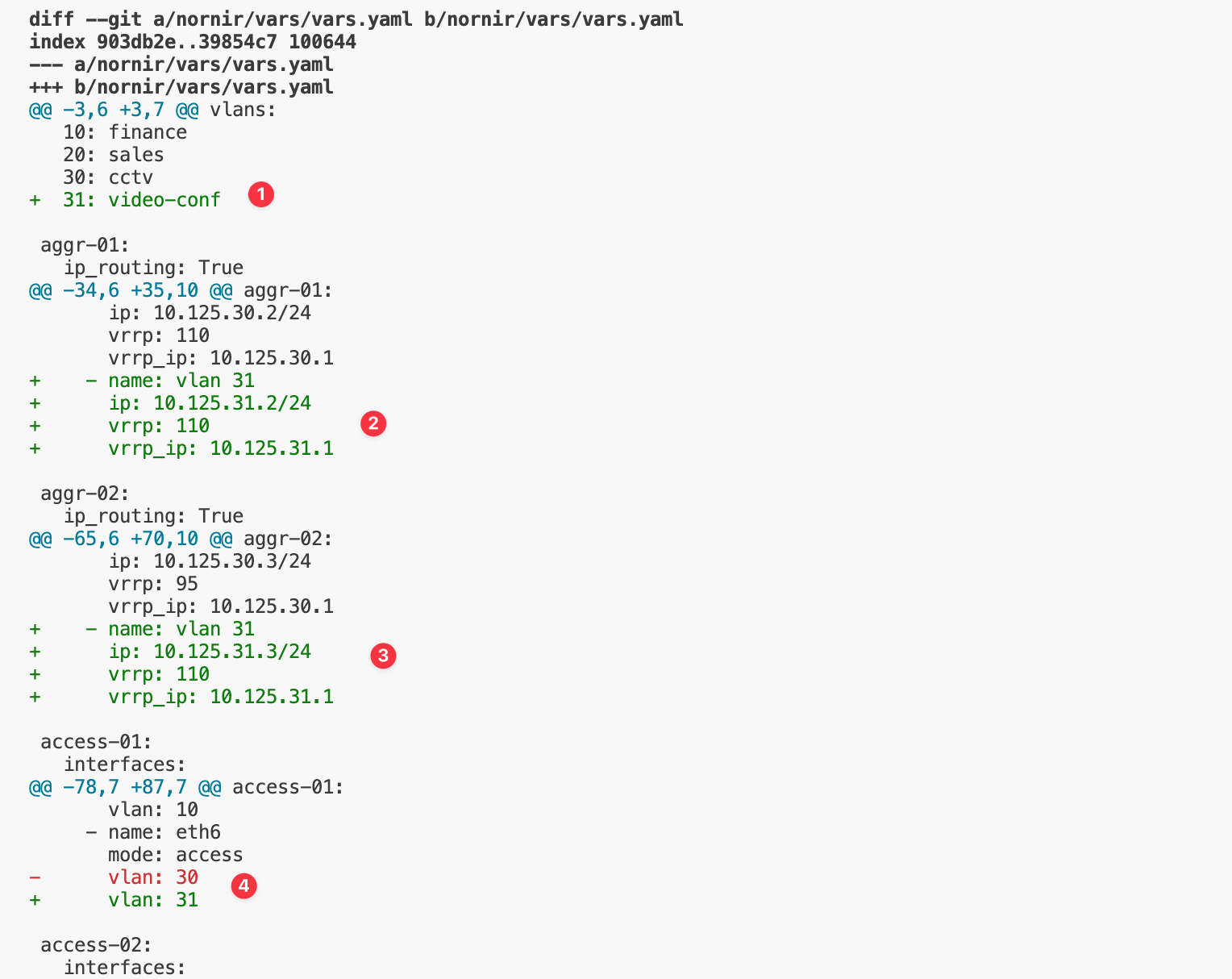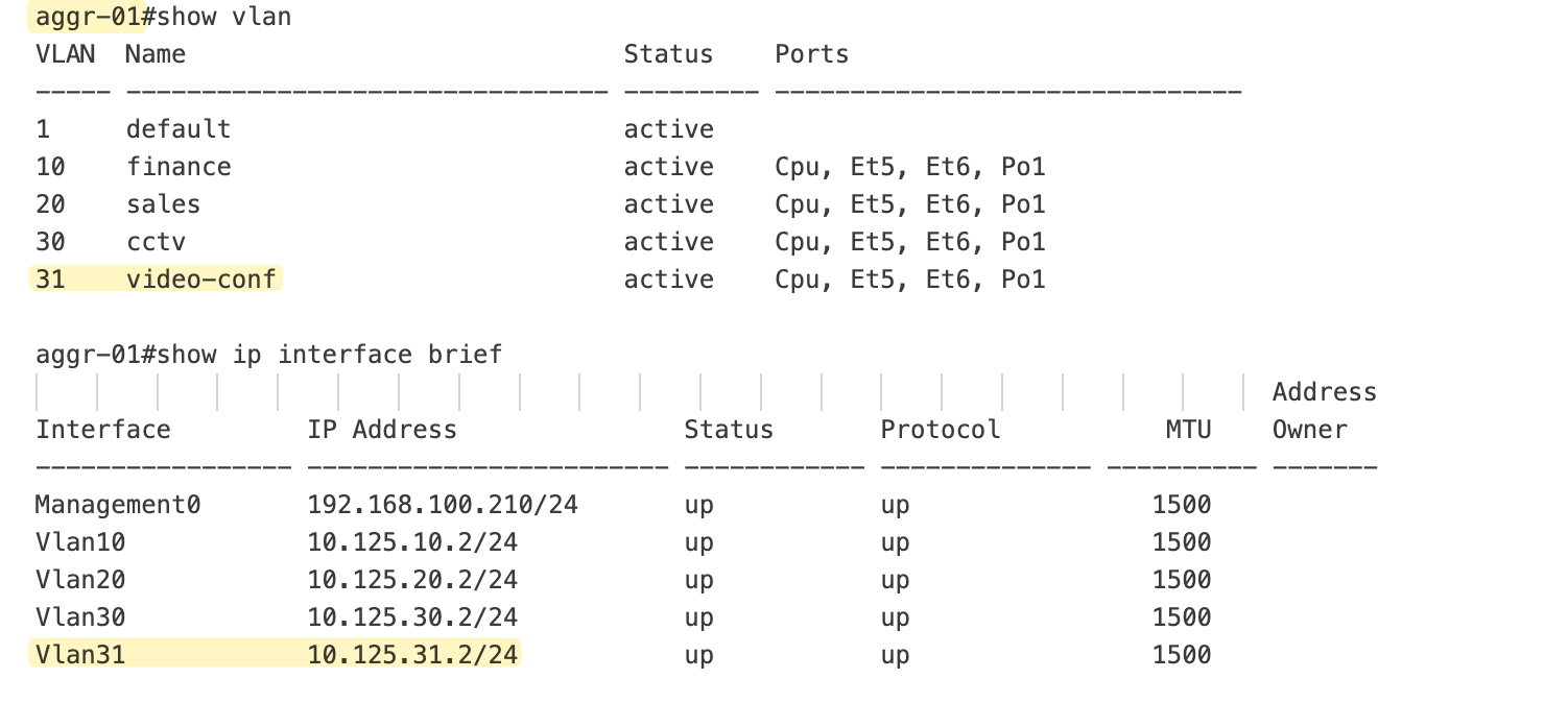 vlan: 30Here, I’m adding the new VLAN (31: video-conf) to the list and configuring the new subnet 10.125.31.0/24 on both distribution switches. These variables are then rendered into the actual configuration using the Jinja2 template. I'm also configuring one of the switch ports as VLAN 31 (eth6 on access-01 switch)