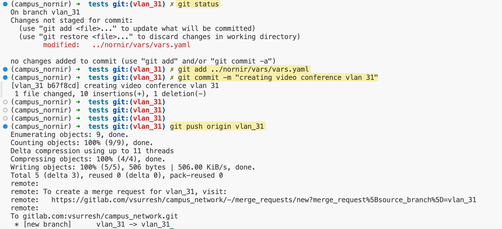Once the changes are made, you can commit the changes by running git add to stage the modified file, followed by git commit -m "Added VLAN 31" to commit the changes. Finally, push the changes to your branch using git push origin.